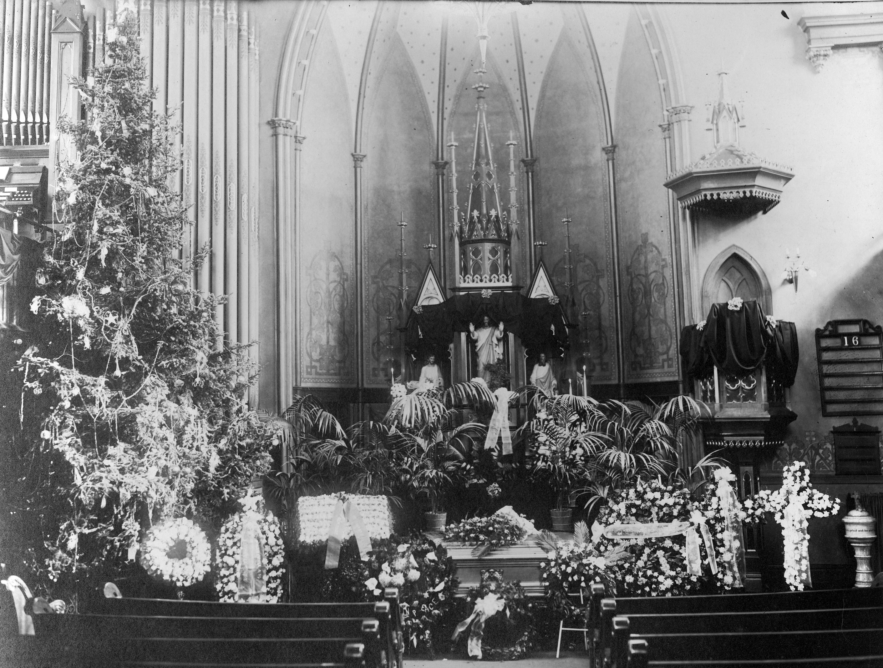 | Description: | This photograph shows the casket of Lieutenant Harry Bassett of the Chicago Fire Department surrounded by flowers and wreaths at the front of the church where his funeral was held. |