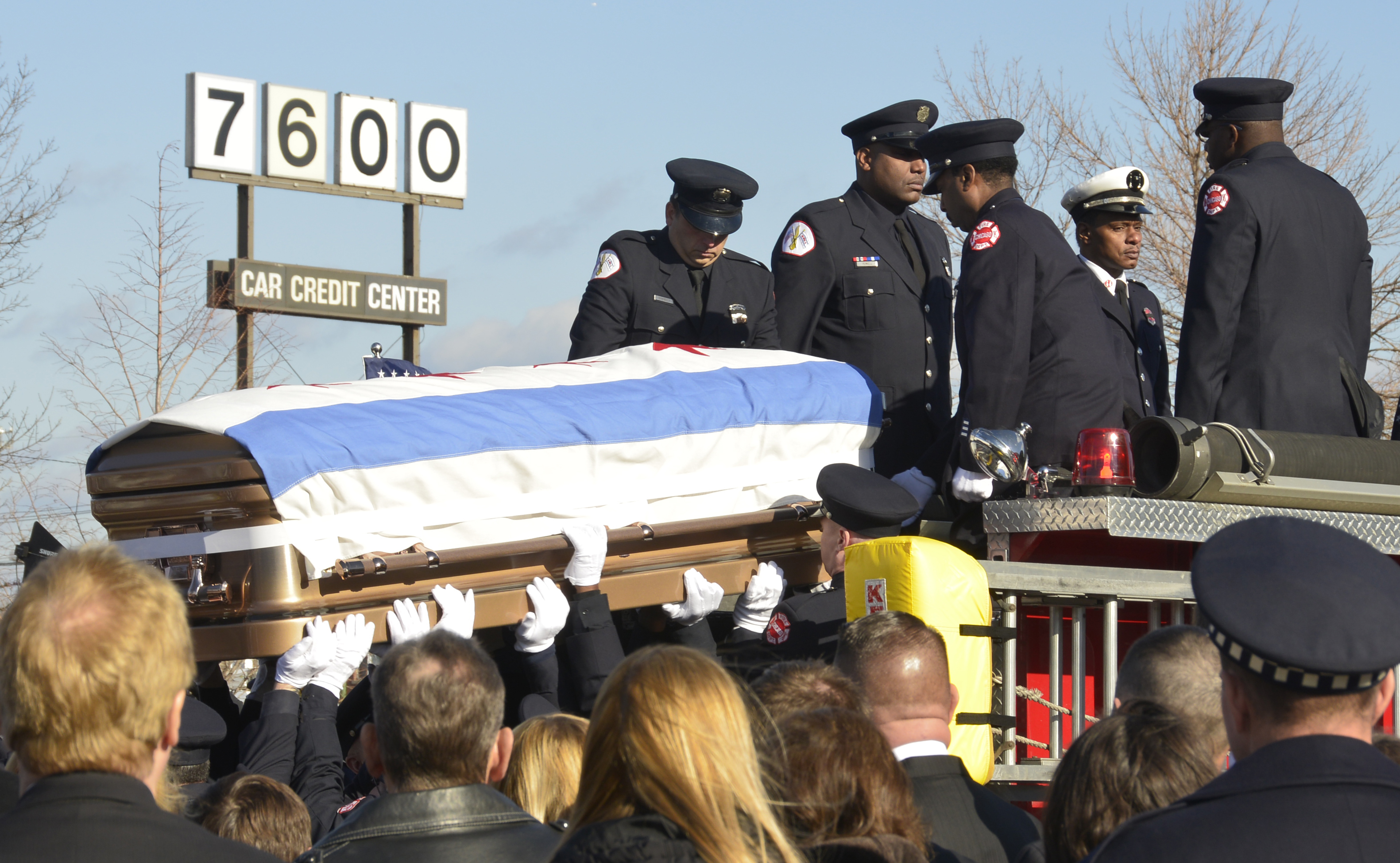 Description: | This photograph shows firefighters lifting the casket of Chicago Fire Department Firefighter Daniel Capuano who died in the line of duty in 2015. |