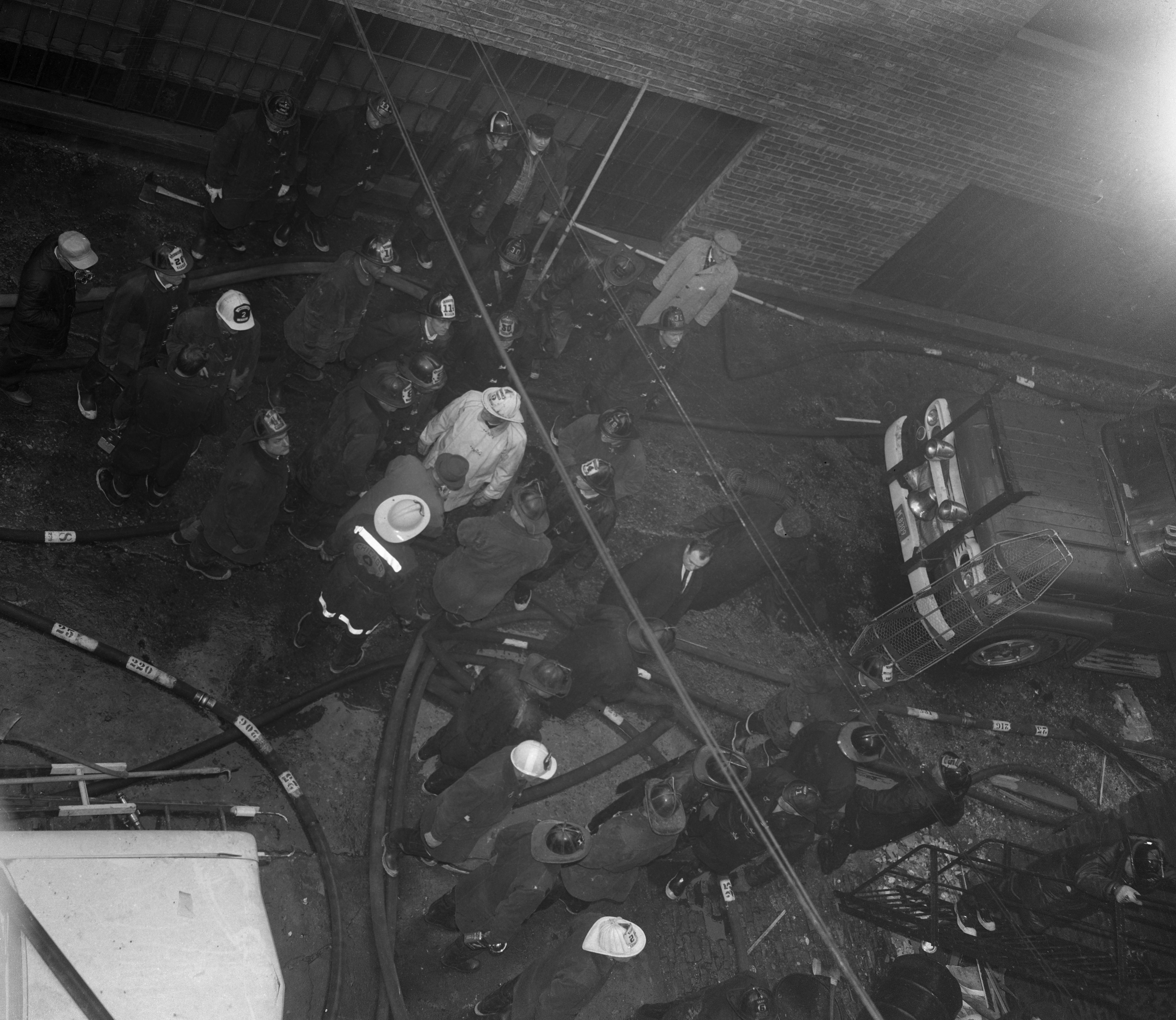 | Description: | This photo shows firefighters gathered outside the building housing the United States Crayon Company where Chicago Fire Department Firefighter Joseph Carone died in the line of duty in 1964. |