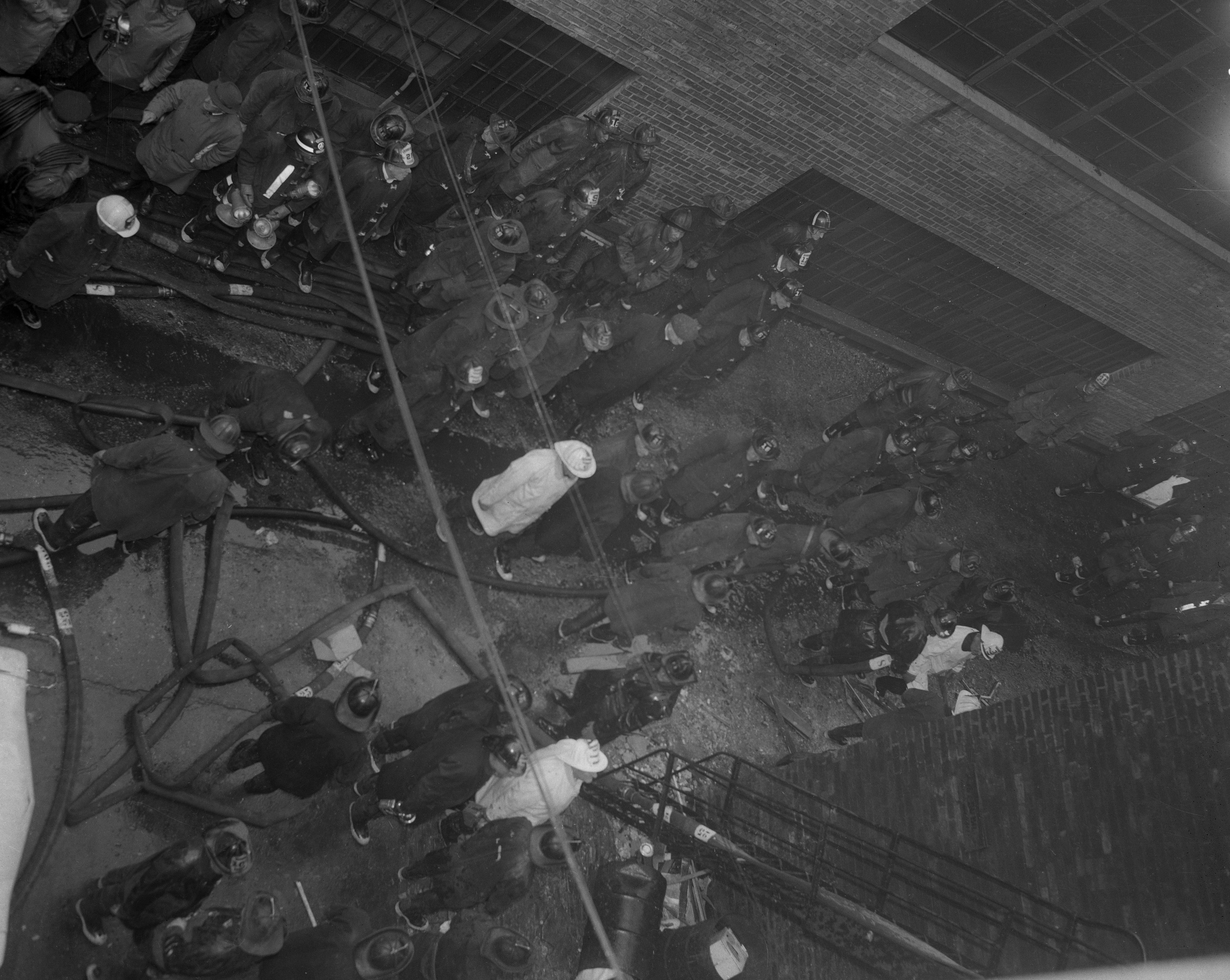 | Description: | This photo shows firefighters outside the building housing the United States Crayon Company where Chicago Fire Department Joseph Capuno died in the line of duty in 1964. |