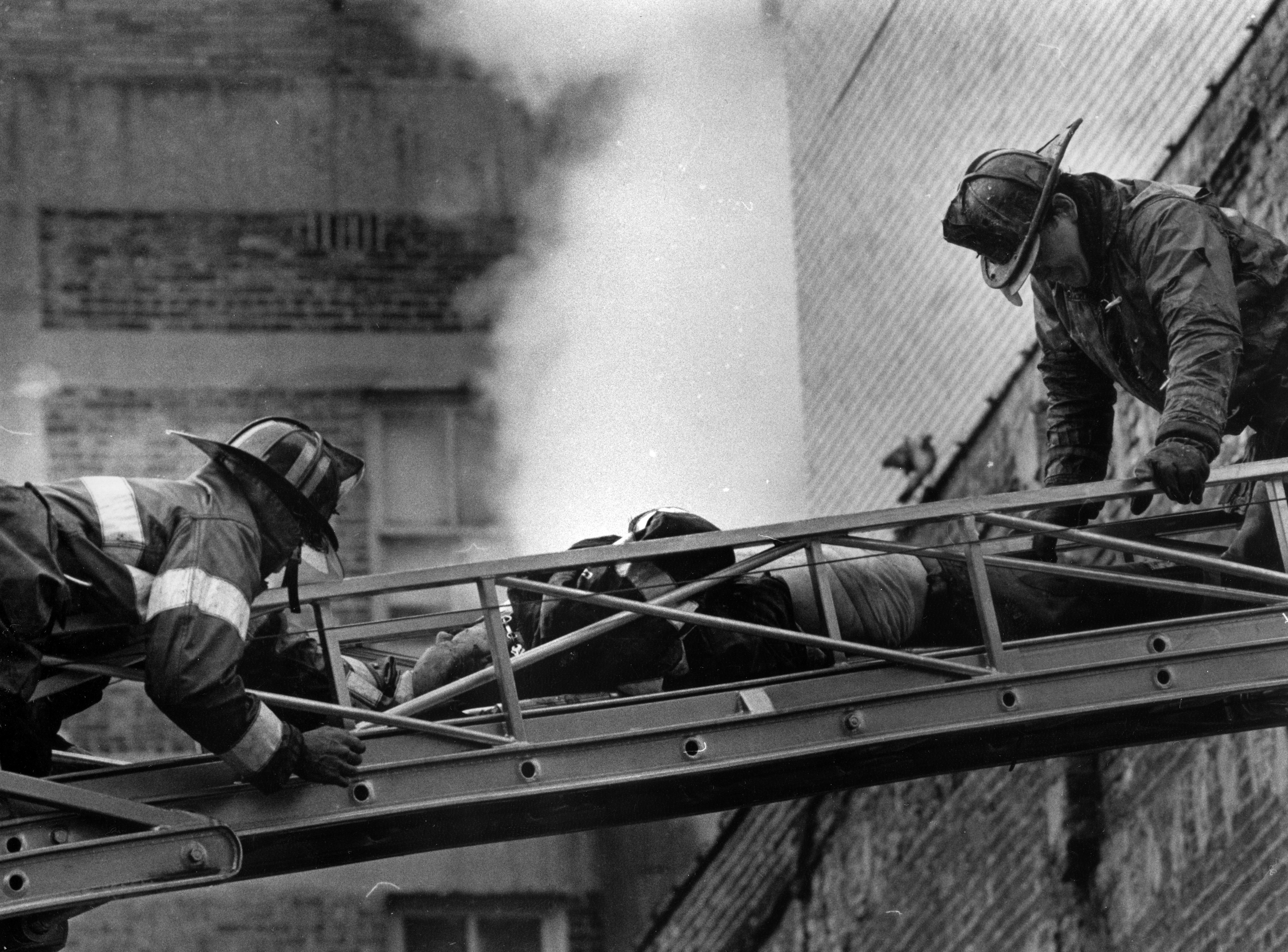 Description: | This photograph shows two firefighters removing an injured person from the Mark Twain Hotel where Chicago Fire Department Lieutenant Edmond Coglianese died in the line of duty in 1986. |