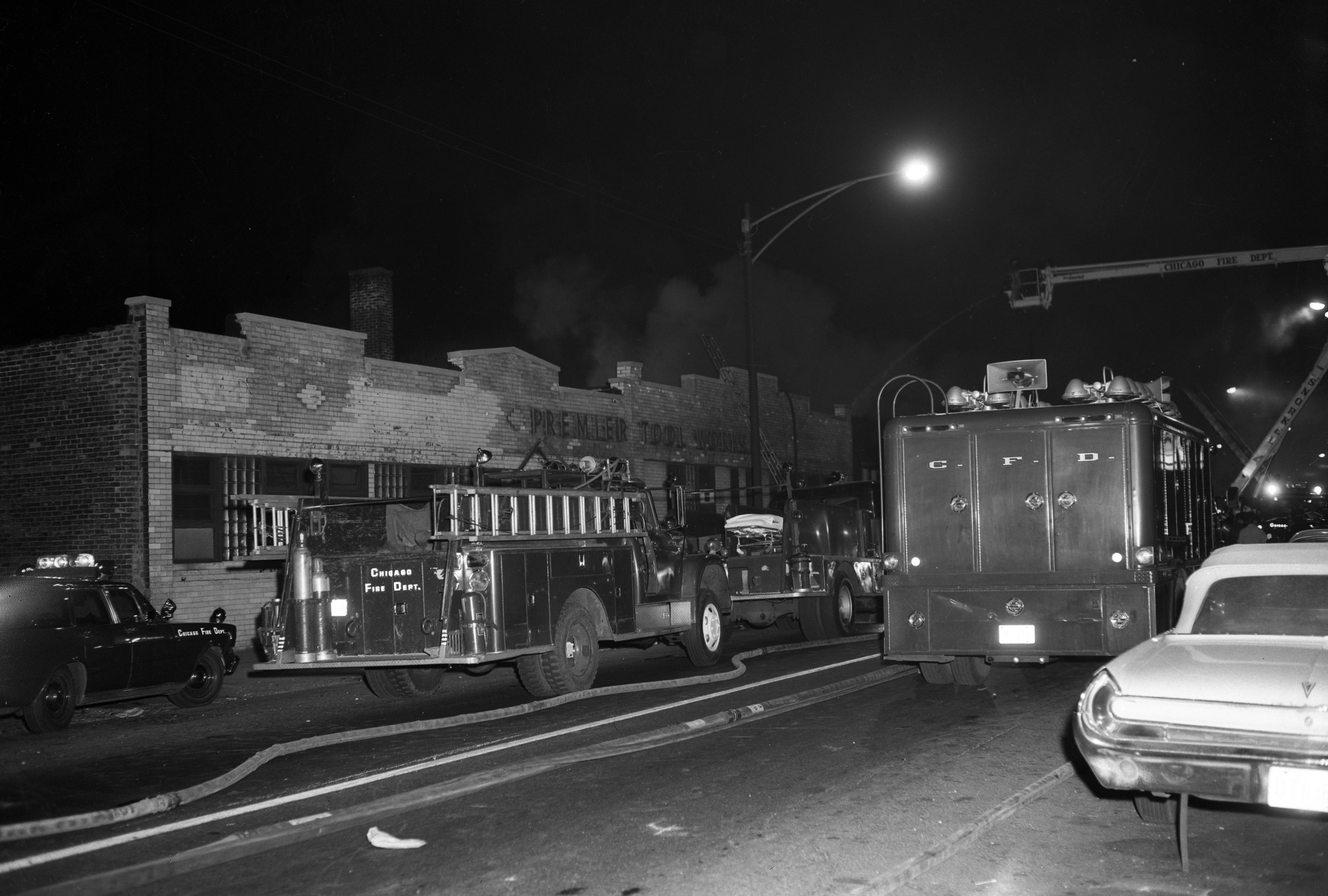 Description: | This photograph shows fire trucks parked in the road outside of a factory on Harrison Street where Chicago Fire Department Deputy Fire Marshall John Daugherty died in the line of duty in 1968. |