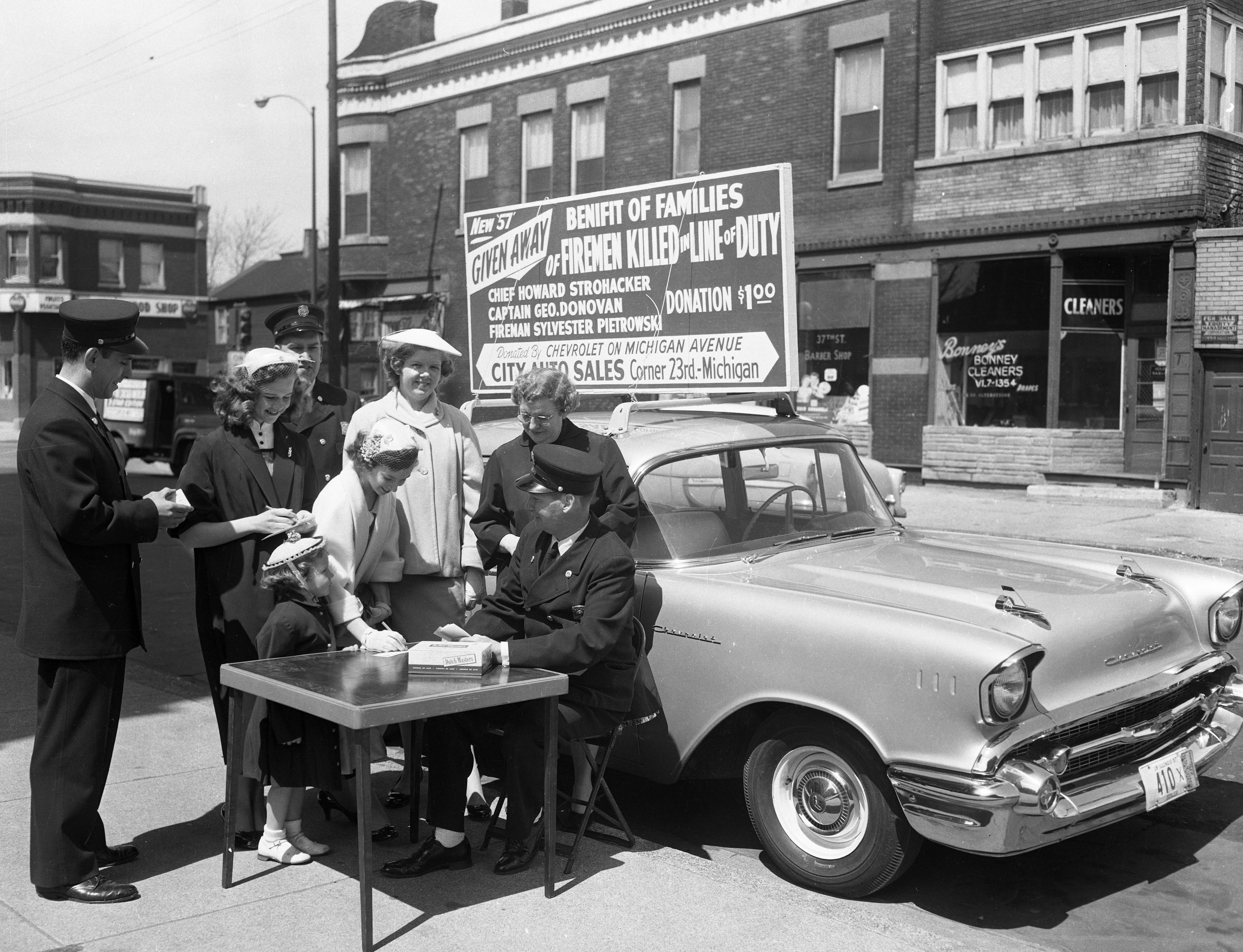 | Description: | This photograph shows people donating money to benefit the families of Chief Strohacker Captain Donovan and Fireman Pietrowski in exchange for the chance of winning a new car. |