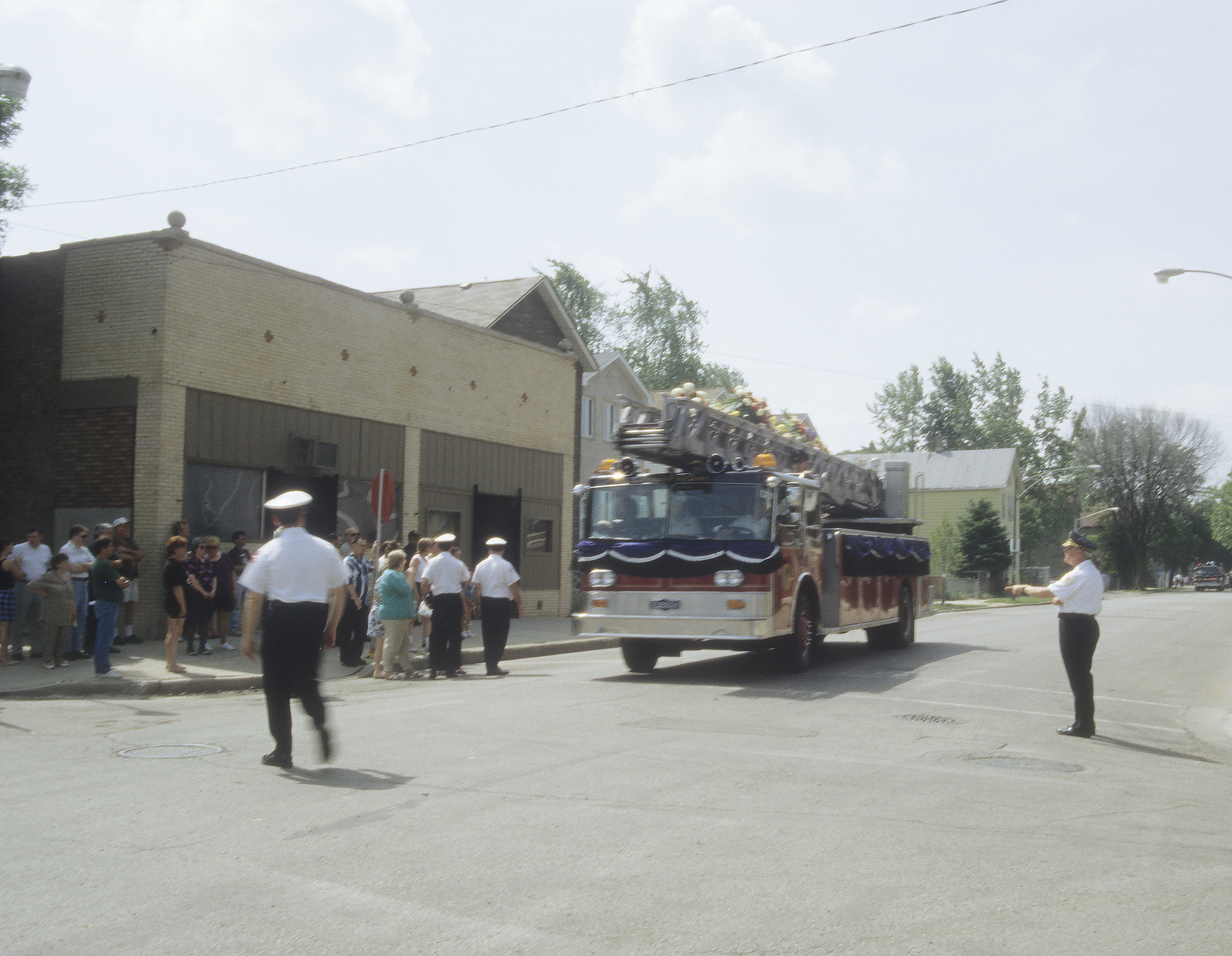 | Description: | This photograph shows a fire truck adorned with bunting and flowers in honor of Chicago Fire Department Firefighter Michael Drobitsch who died in the line of duty in 1997. |