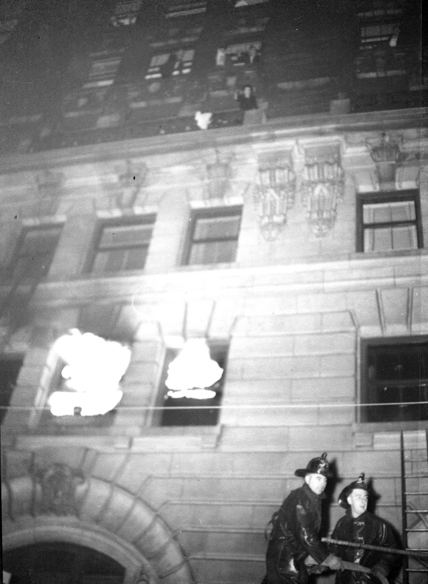 Description: | This photograph shows residents leaning out of the windows of the La Salle Hotel and firefighters operating on the ground below them. |