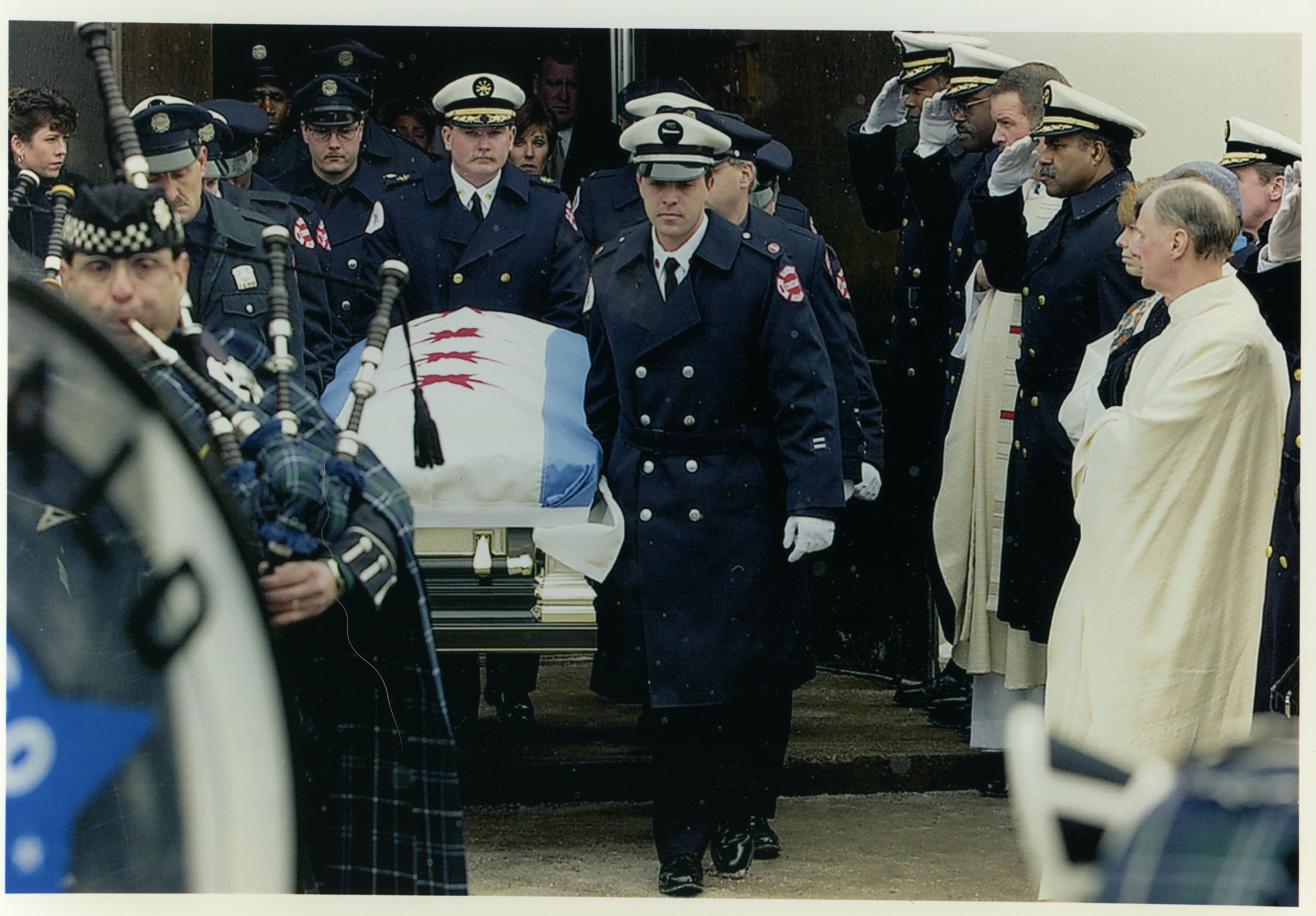 Description: | This photograph shows firefighters carrying the casket of Chicago Fire Department Lieutenant Scott Gillen who died in the line of duty in 2000. |