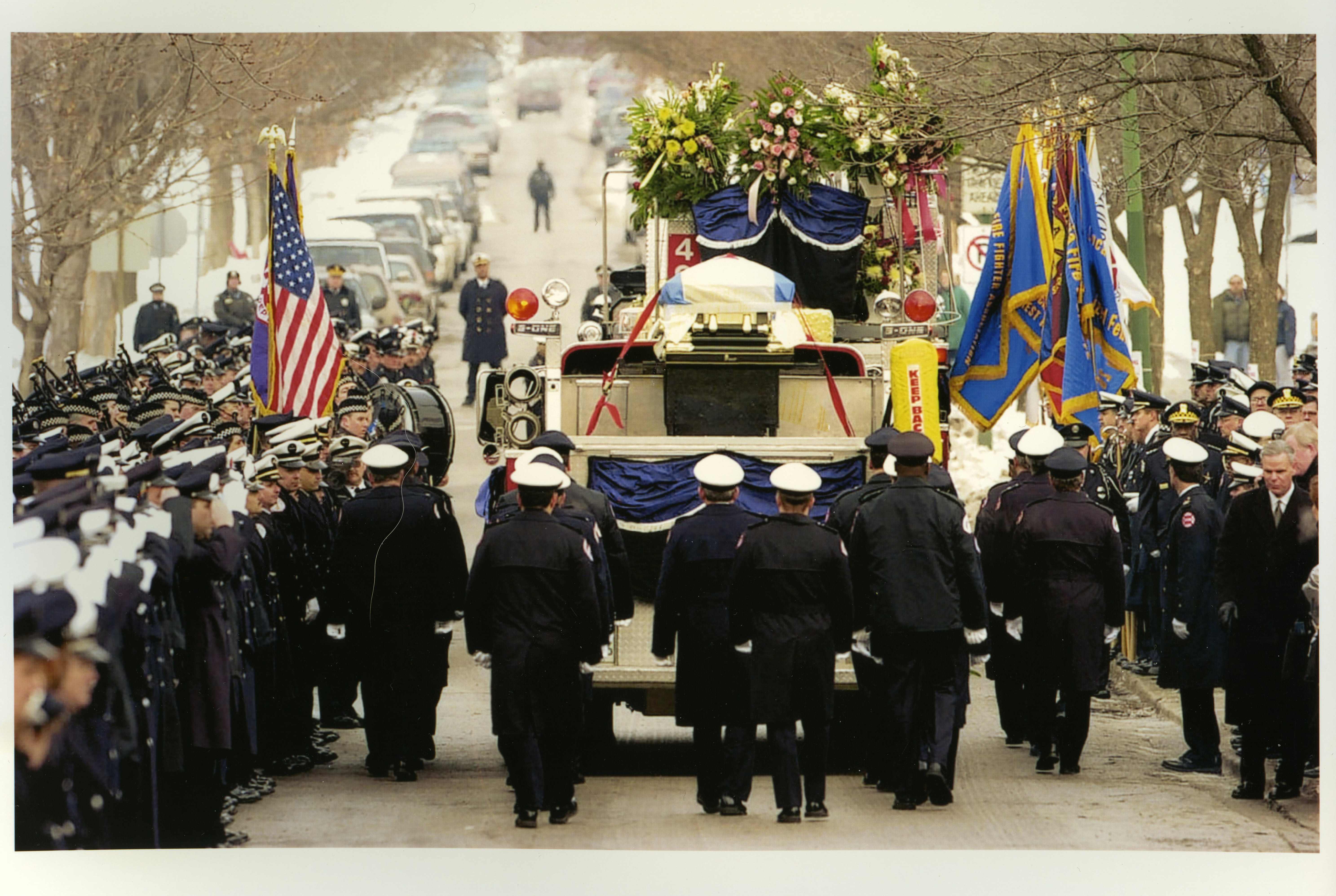 Description: | This photograph shows firefighters saluting the casket of Chicago Fire Department Lieutenant Scott Gillen who died in the line of duty in 2000. |