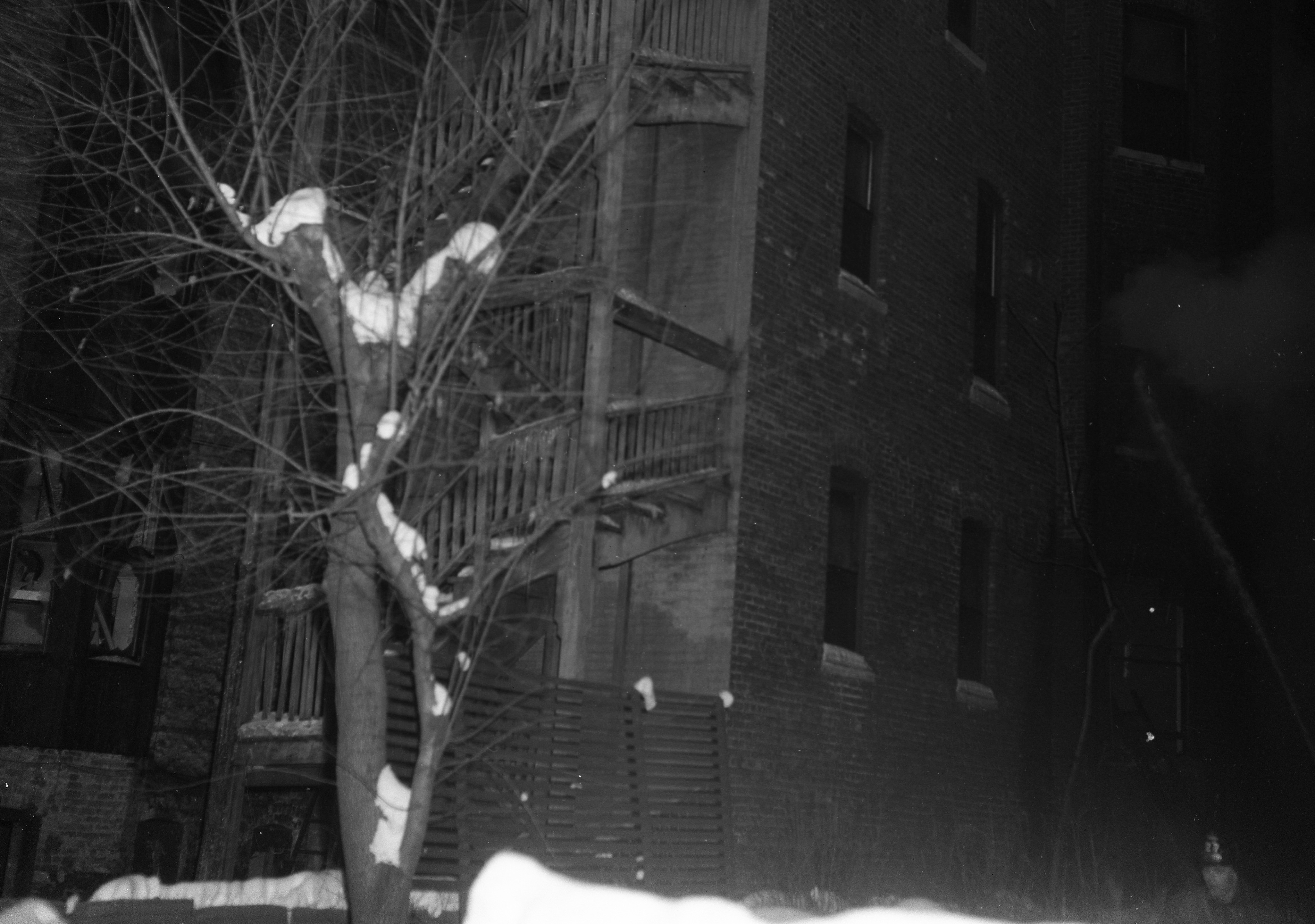This photograph shows the exterior of a vacant apartment building.