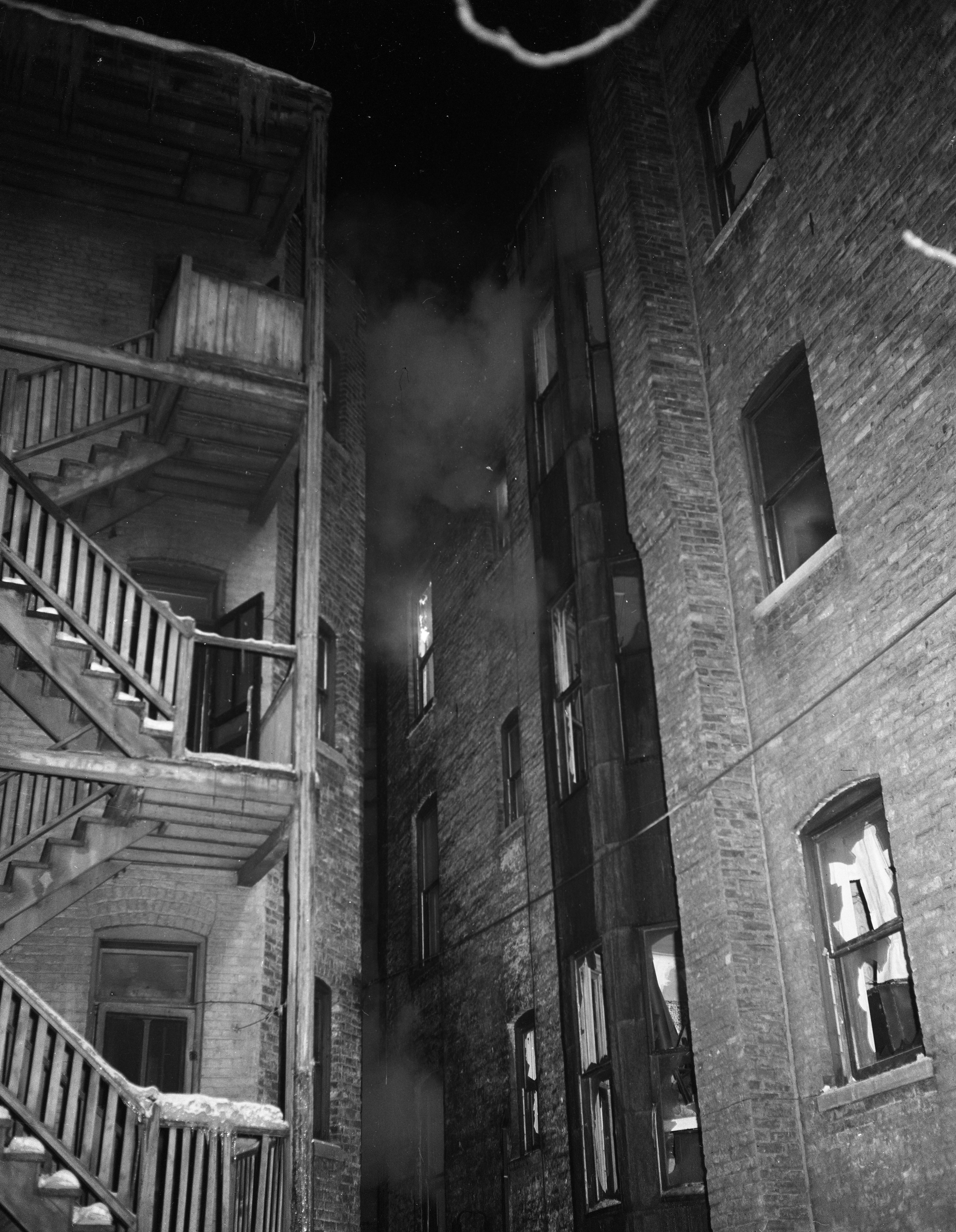 This photograph shows broken and open windows with smoke coming from them in a vacant apartment building.