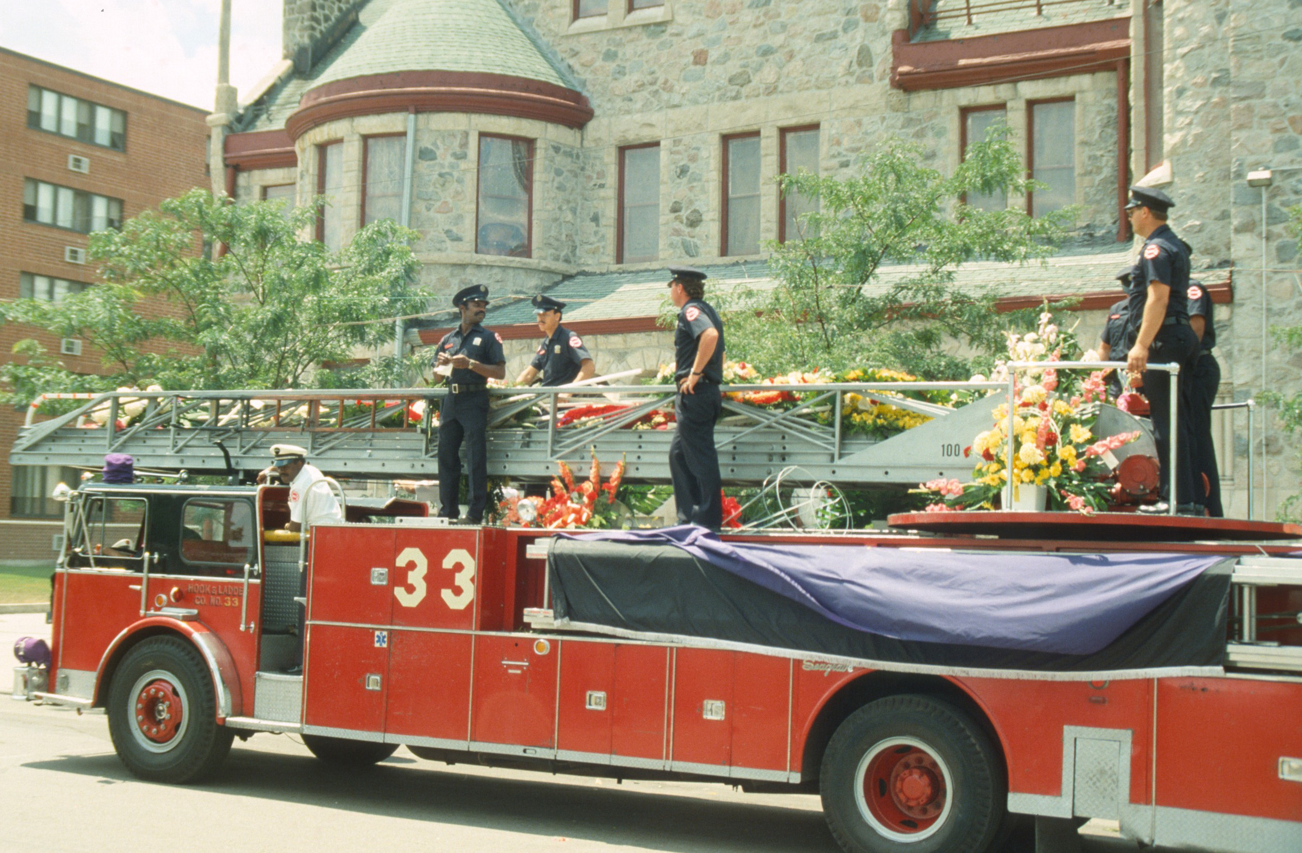 Description: | This photograph shows firefighters standing on top of a fire apparatus decorated for Chicago Fire Department Firefighter James Hill who died in the line of duty in 1987. |