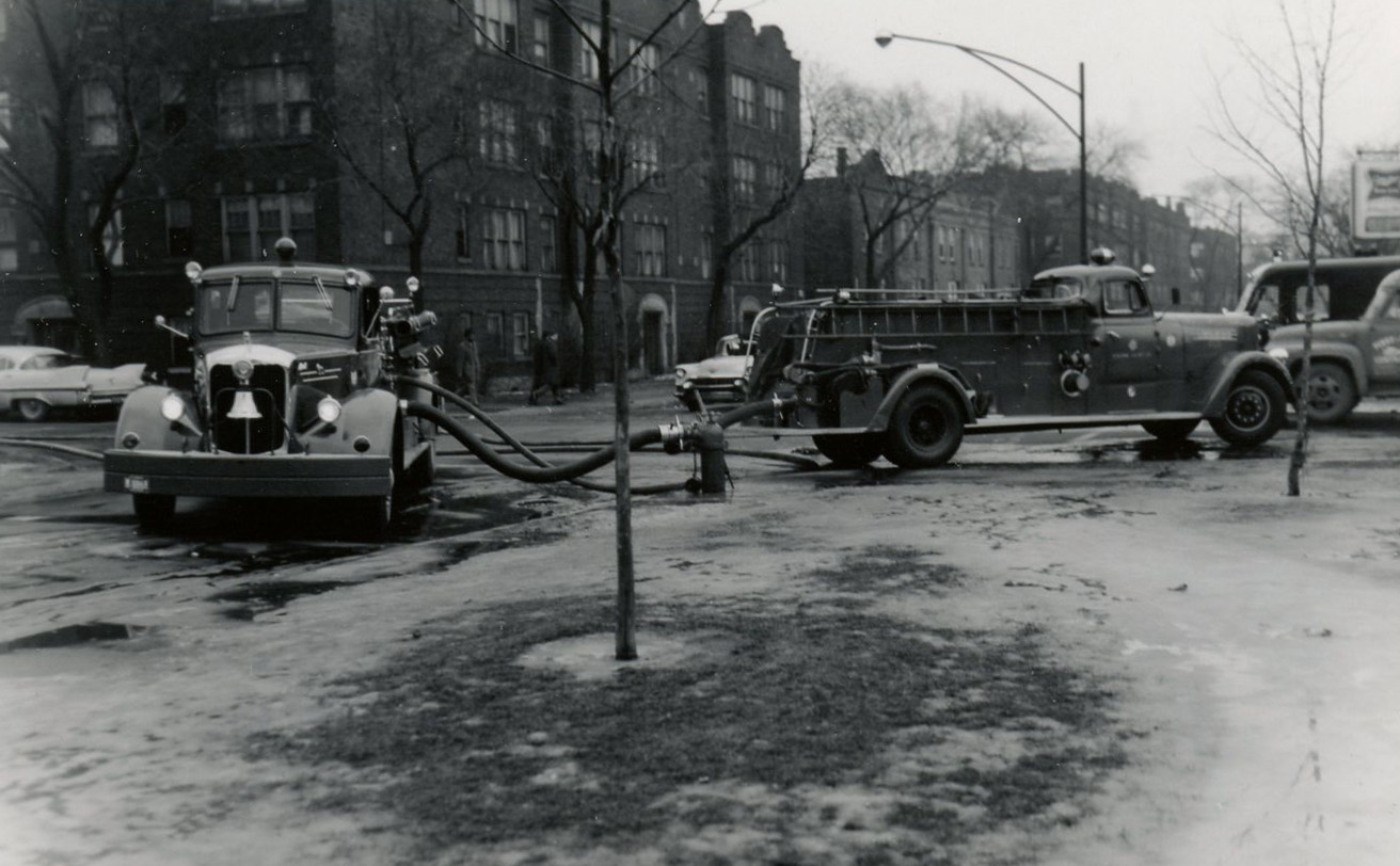 Title: | Multiple Fire Apparatuses Connected to Hydrant, Photograph |