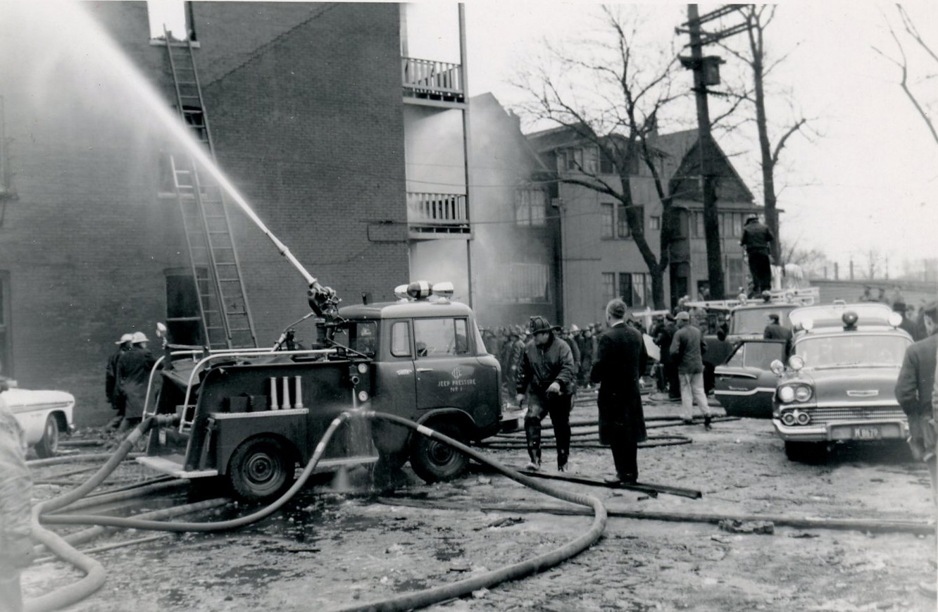 Description: | This photograph shows water being applied to the fire via a fire apparatus at the E. 70th Street Apartment Building fire. |