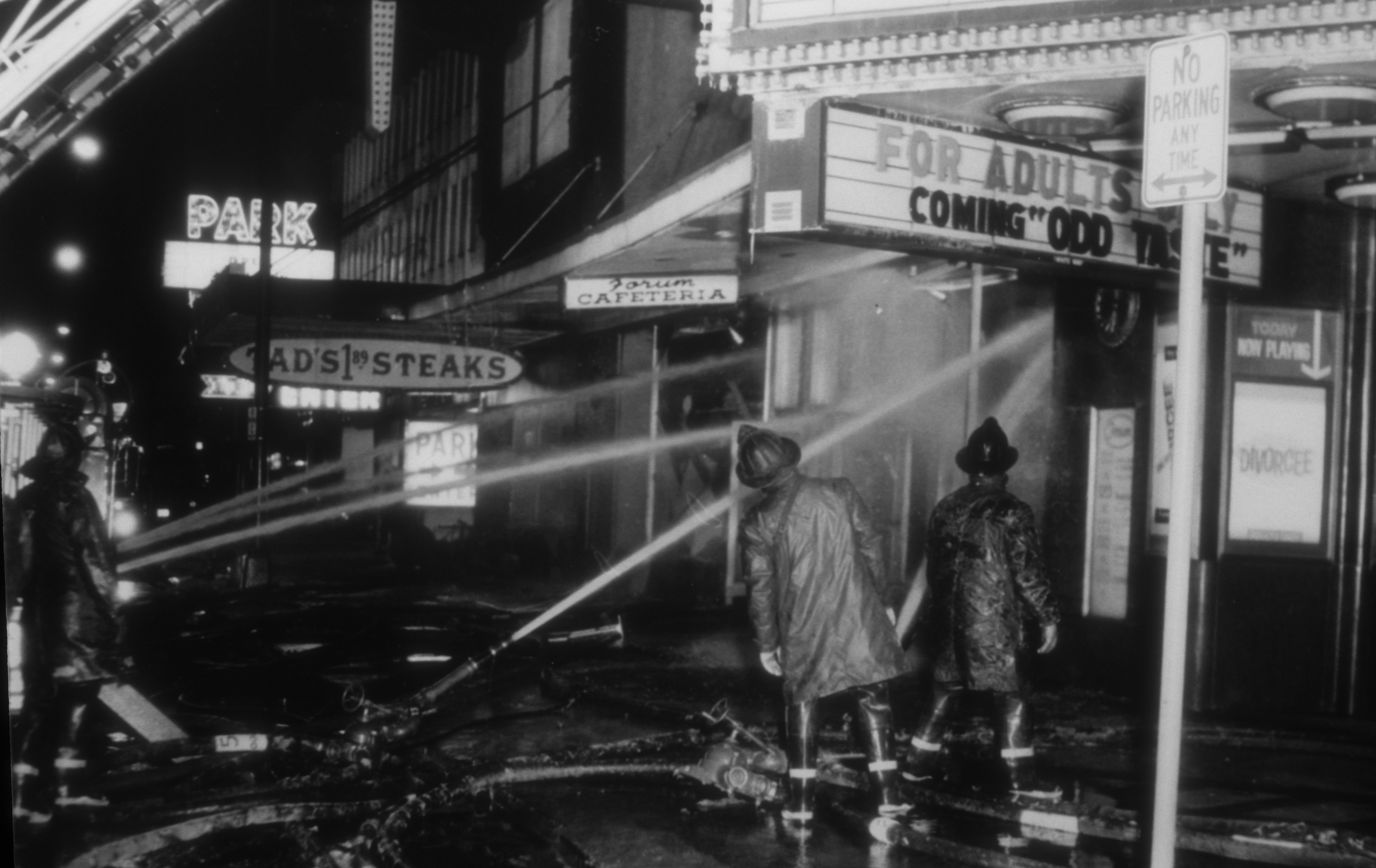 This photograph shows firefighters directing their hoses through the open front of the Forum Cafeteria.