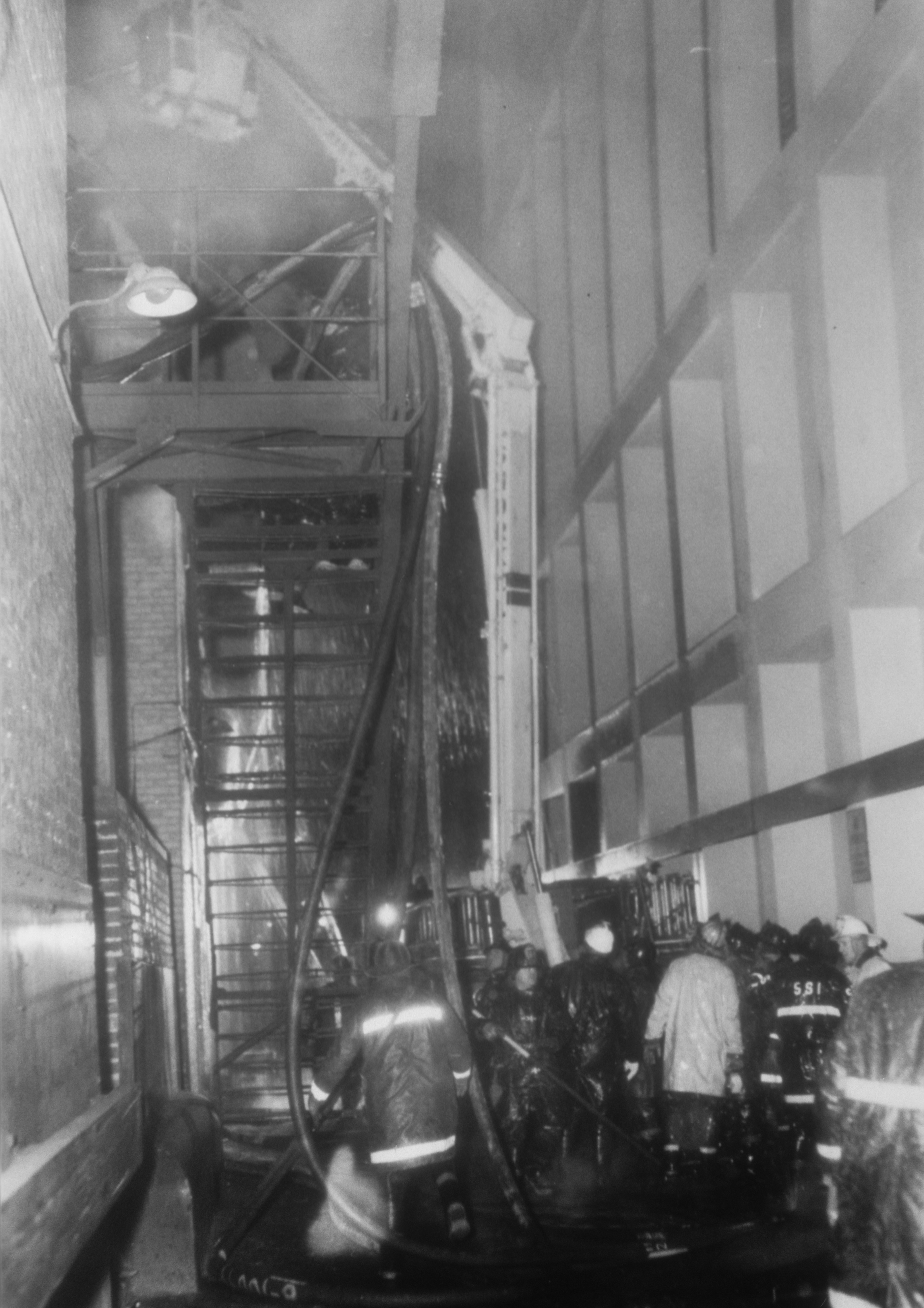 Description: | This photograph shows firefighters surrounding a snorkel in the space between two buildings during the Forum Cafeteria Fire. |