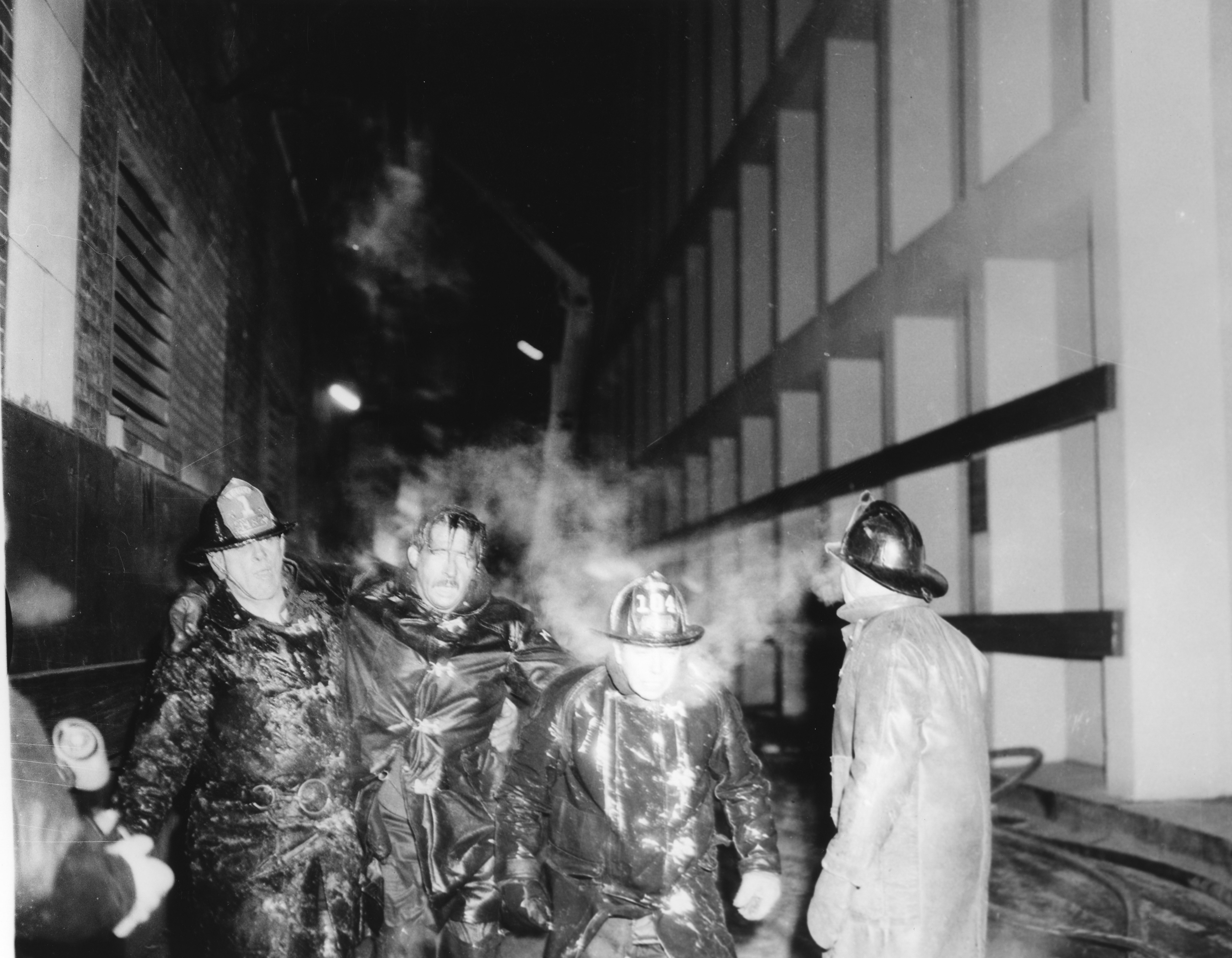 This photograph shows two firefighters supporting a third who is not wearing his helmet.