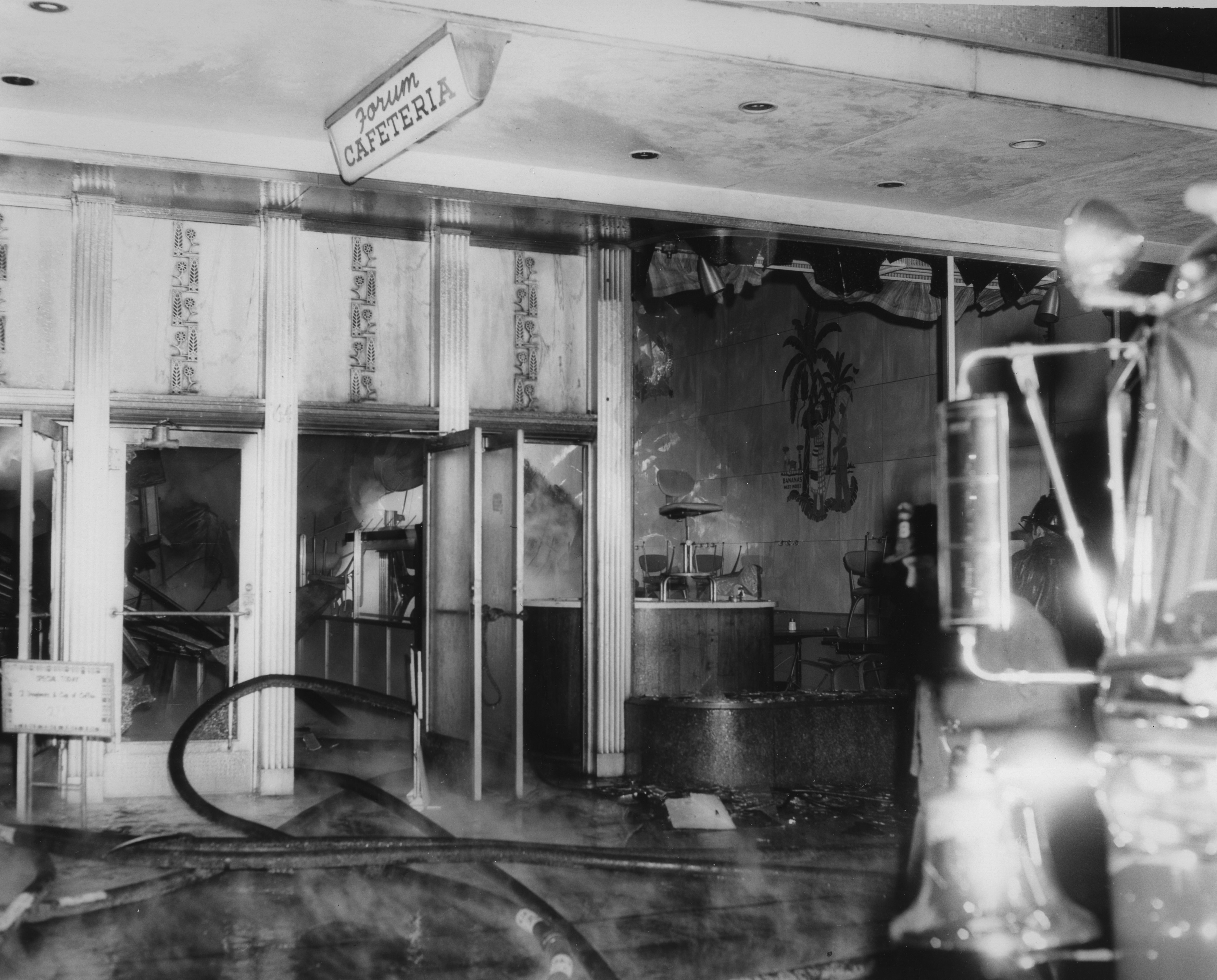 This photograph shows the front of the Forum Cafeteria after the roof collapse.