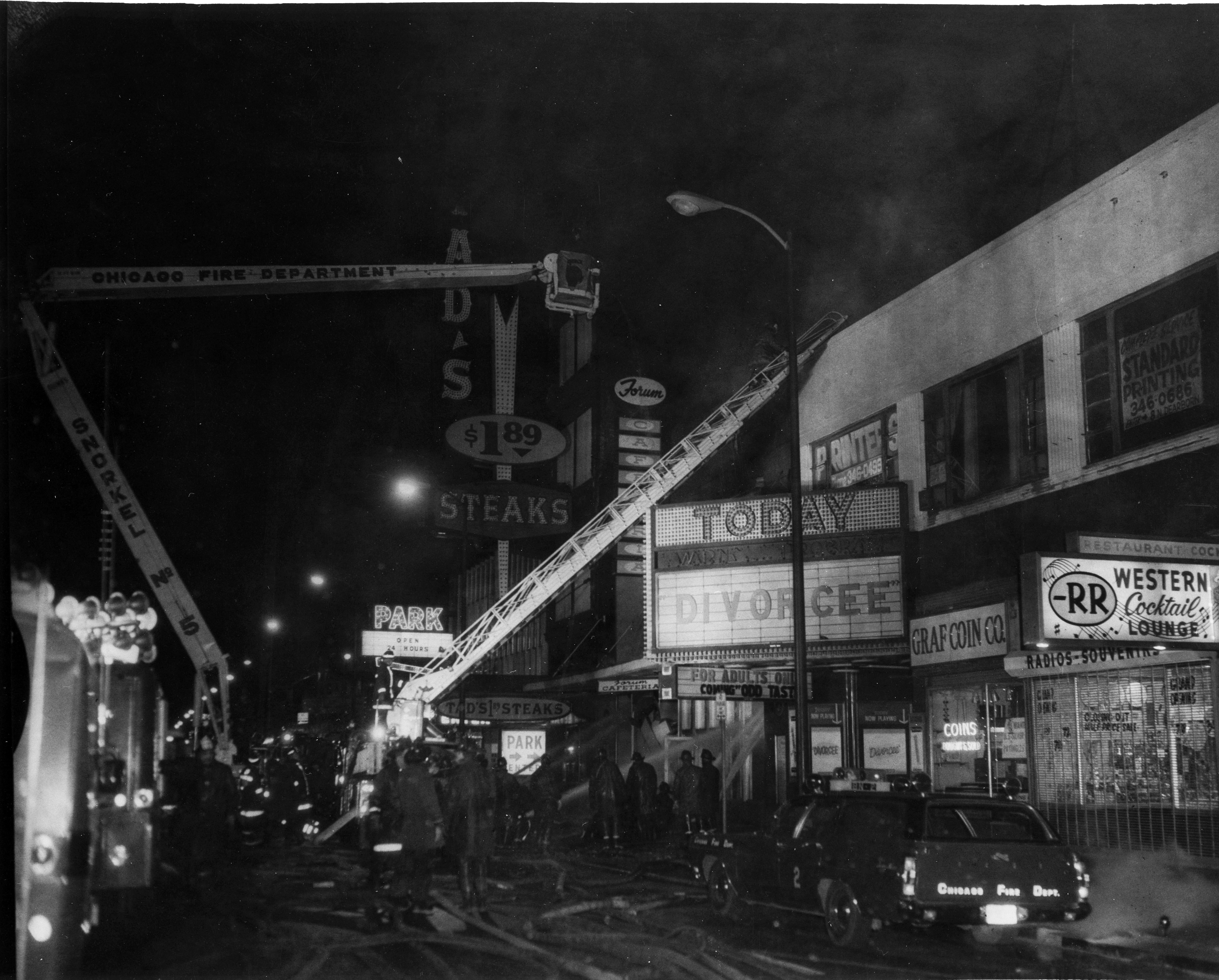 Description: | This photograph shows a street view of the firefighters and apparatus working to extinguish the Forum Cafeteria Fire. |