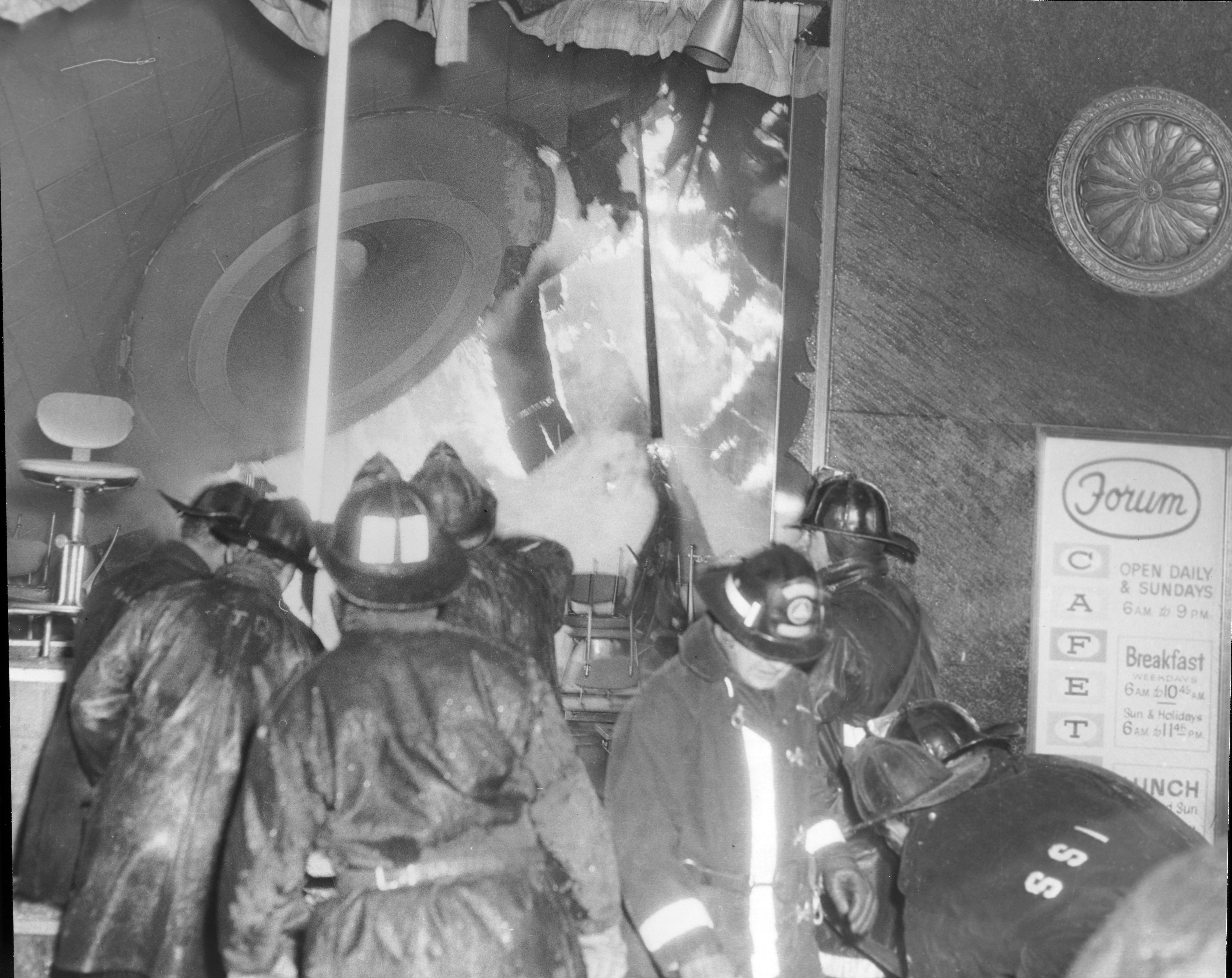 This photograph shows firefighters looking into the Forum Cafeteria after the roof collapse.