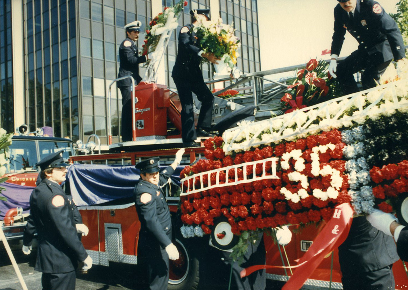 Description: | This photograph shows firefighters placing decorations including vases of flower and a replica of Engine 35 on the fire apparatus in preparation for the funeral service of Chicago Fire Department Firefighter Raymond Magnus who died in the line of duty in 1985. |