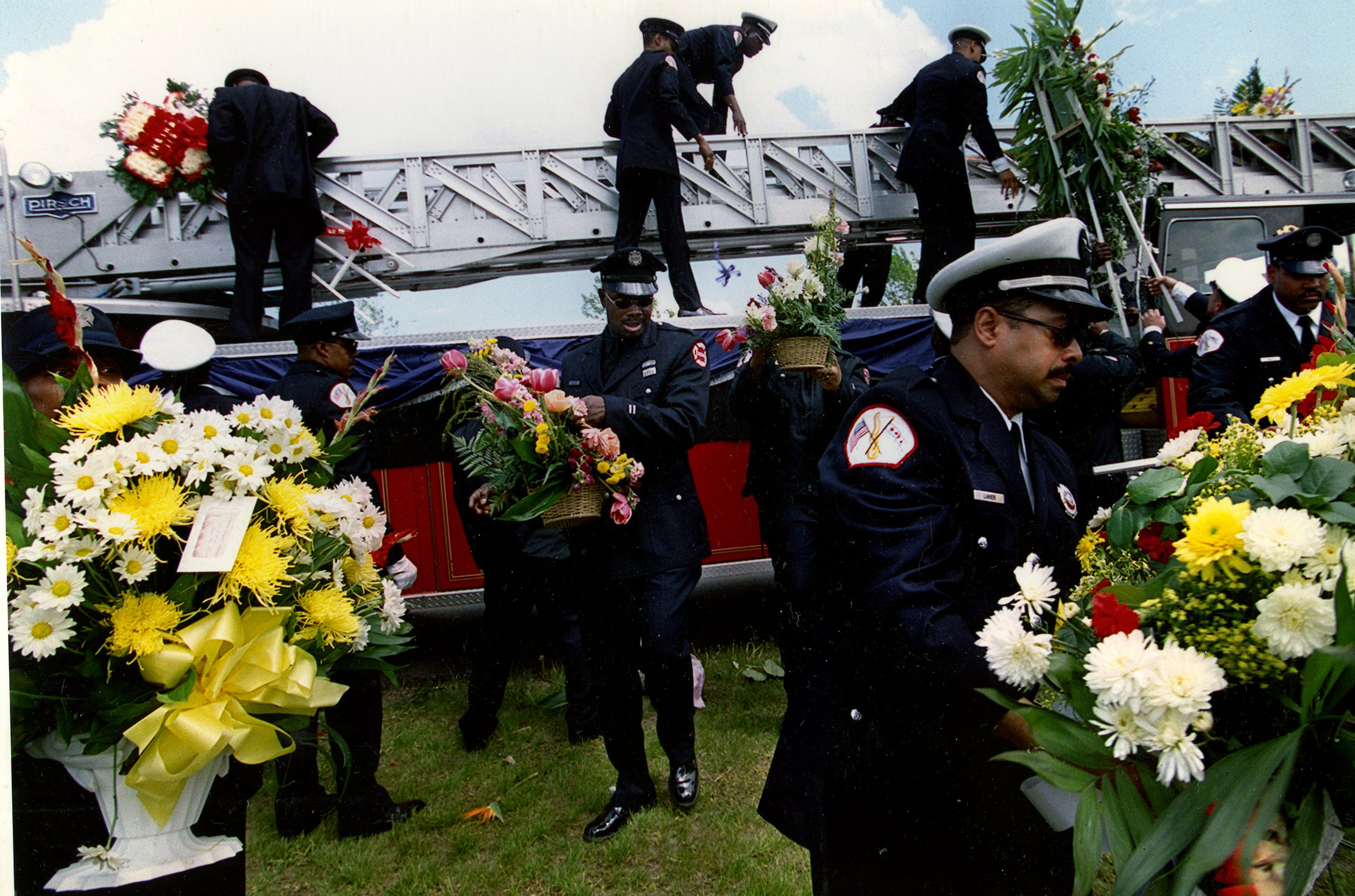 Description: | This photograph shows firefighters decorating a fire apparatus for Chicago Fire Department Lieutenant L.C. Merrell who died in the line of duty in 2000. |