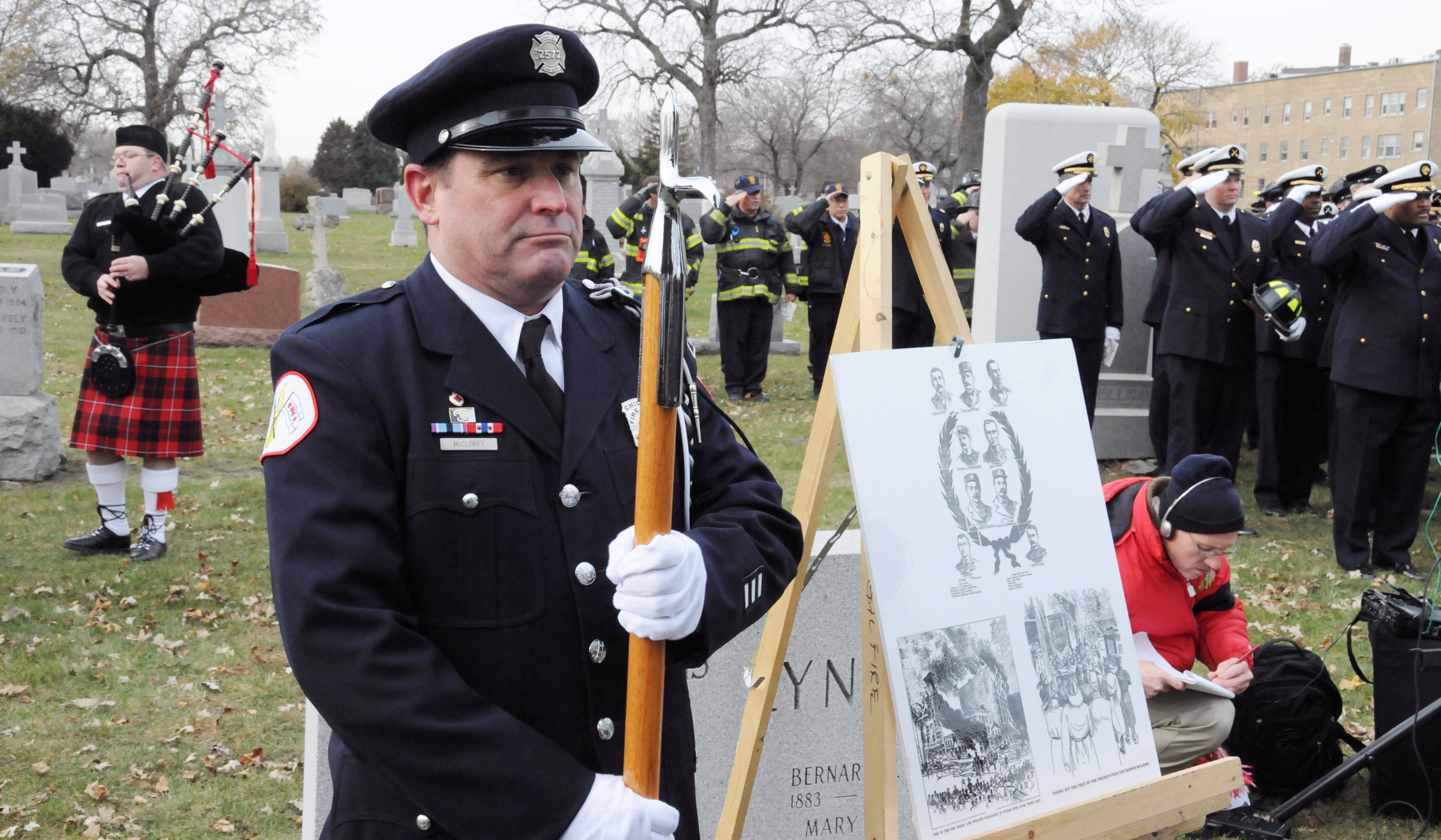 Description: | This photograph shows a fireman holding a pike while others salute at the dedication of a grave marker for Chicago Fire Department Lieutenant Patrick O'Donnell who died in the line of duty in 1895. |