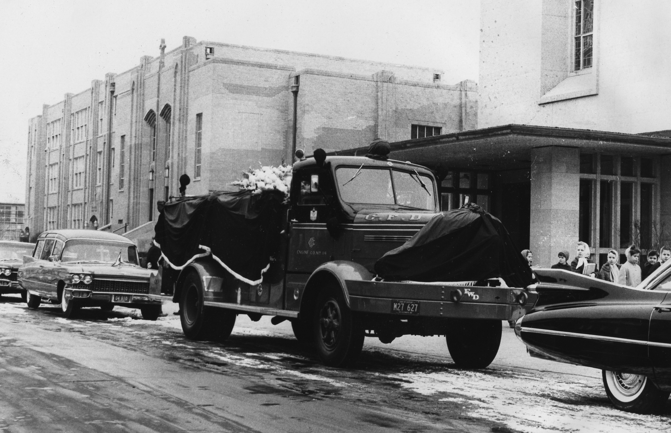 Description: | This photograph shows a piece of fire apparatus decorated with bunting and flowers in honor of Chicago Fire Department Lieutenant Charles Rauch who died in the line of duty in 1961. |