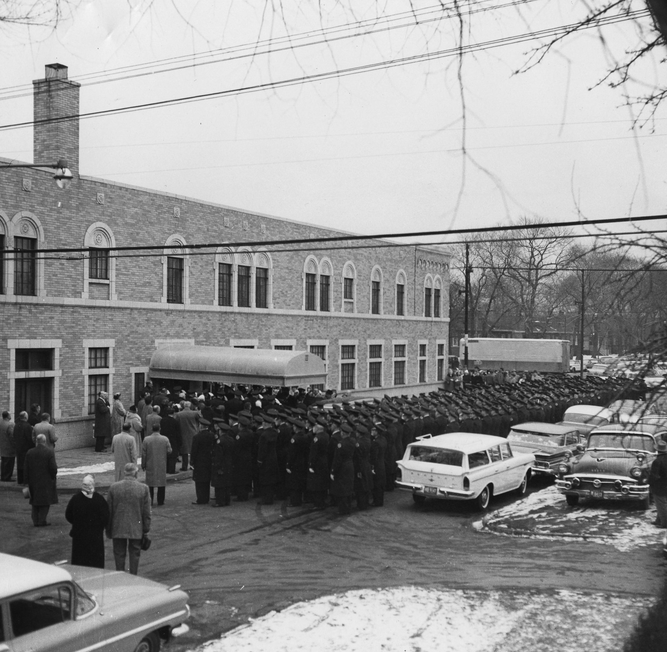 Description: | This photograph shows firefighters saluting in honor of Chicago Fire Department Battalion Chief George Rees who died in the line of duty in 1961. |