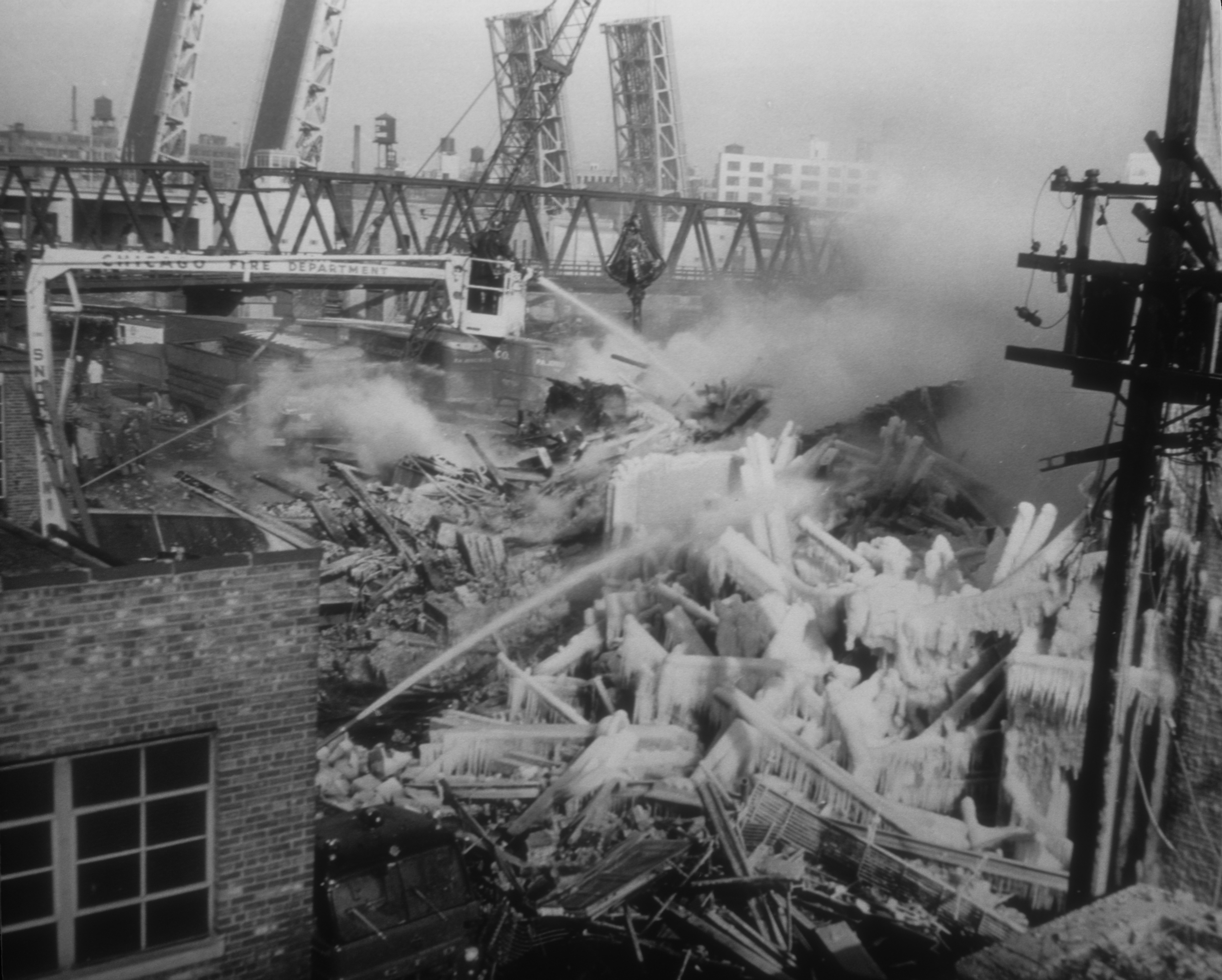 Description: | This photograph shows a firefighter spraying water from a snorkel apparatus onto the ice-covered debris after the Hubbard Street Fire. |
