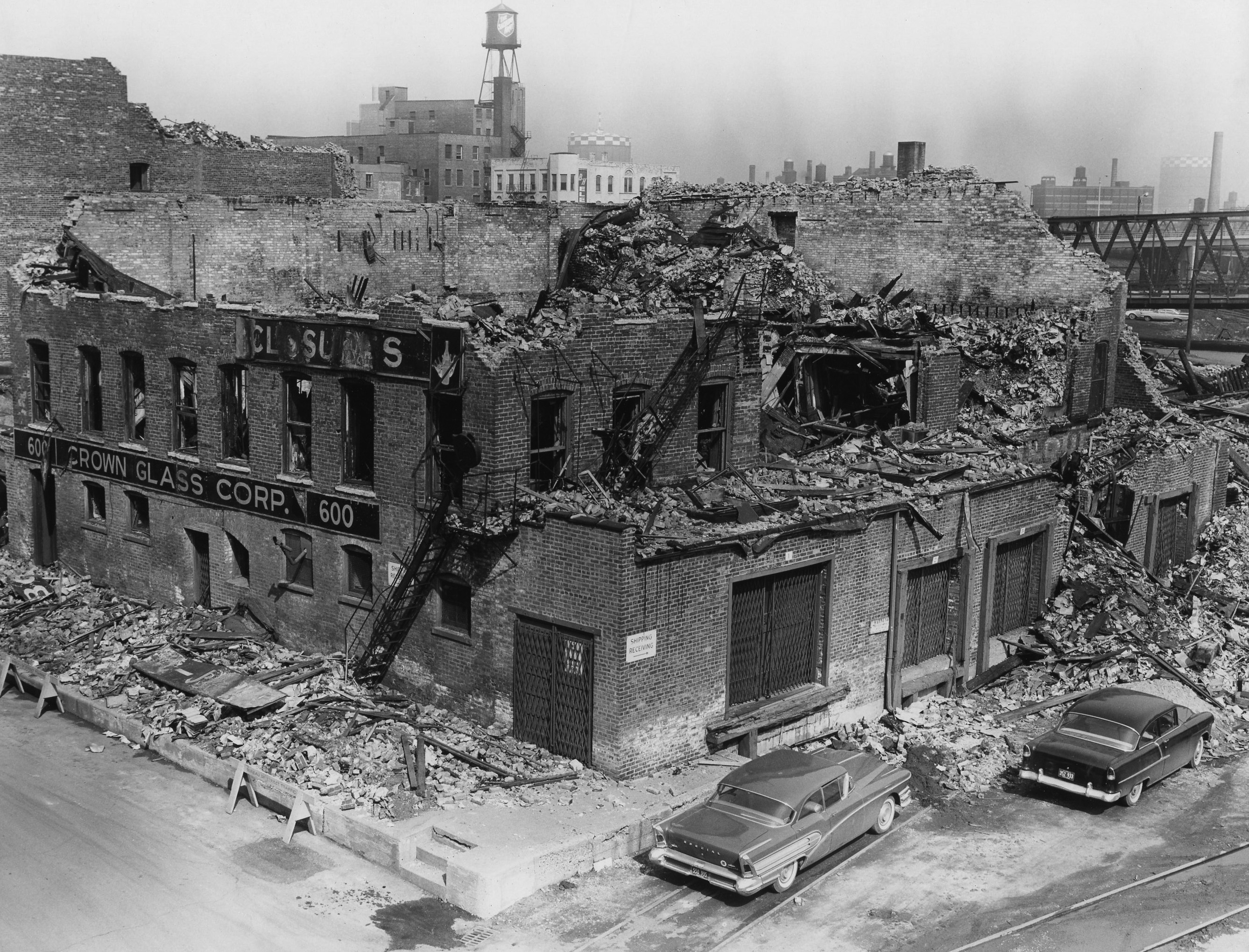 This photograph shows the wreckage of the Crown Glass Corp. building after the Hubbard Street Fire.
