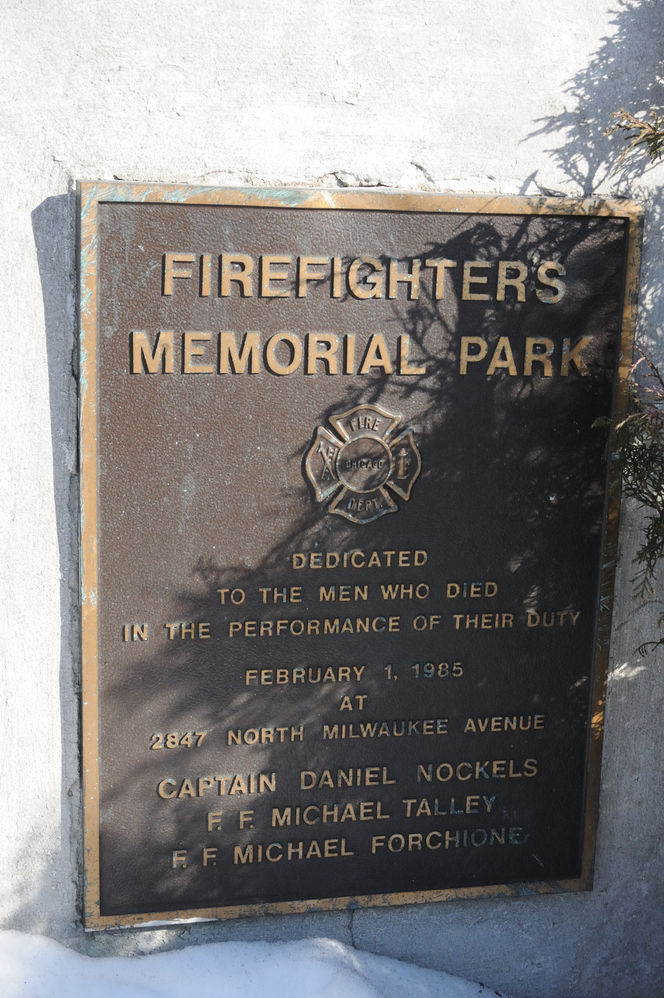 Description: | This photograph shows the plaque dedicating Firefighters' Memorial Park to the firefighters who died in the line of duty at 2847 North Milwaukee Avenue on February 1 1985: Captain Daniel Nockels Firefighter Michael Talley and Firefighter Michael Forchione. |