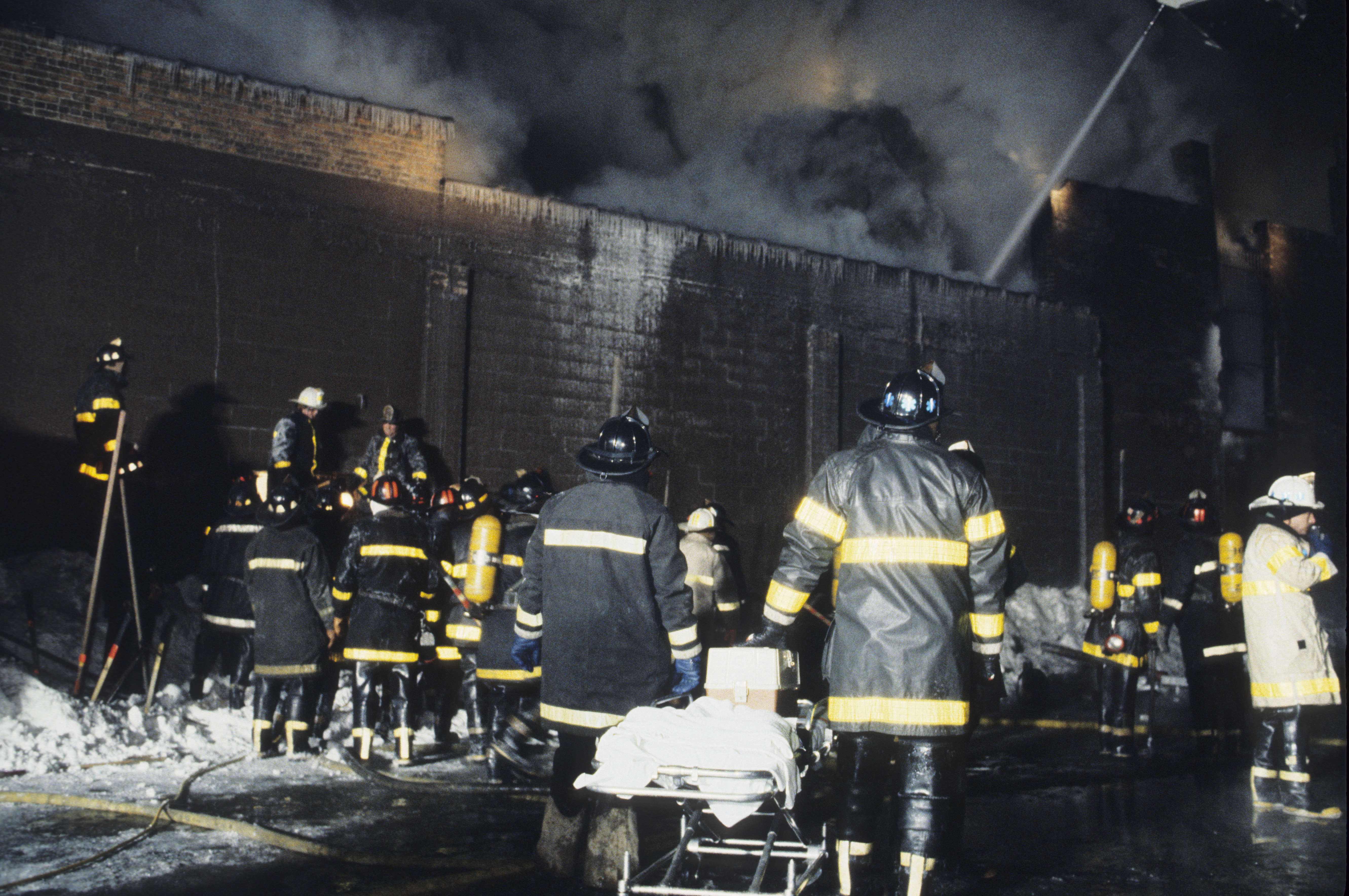 This photograph shows two firefighters wheeling a stretcher at the N. Milwaukee Ave. fire in 1985.