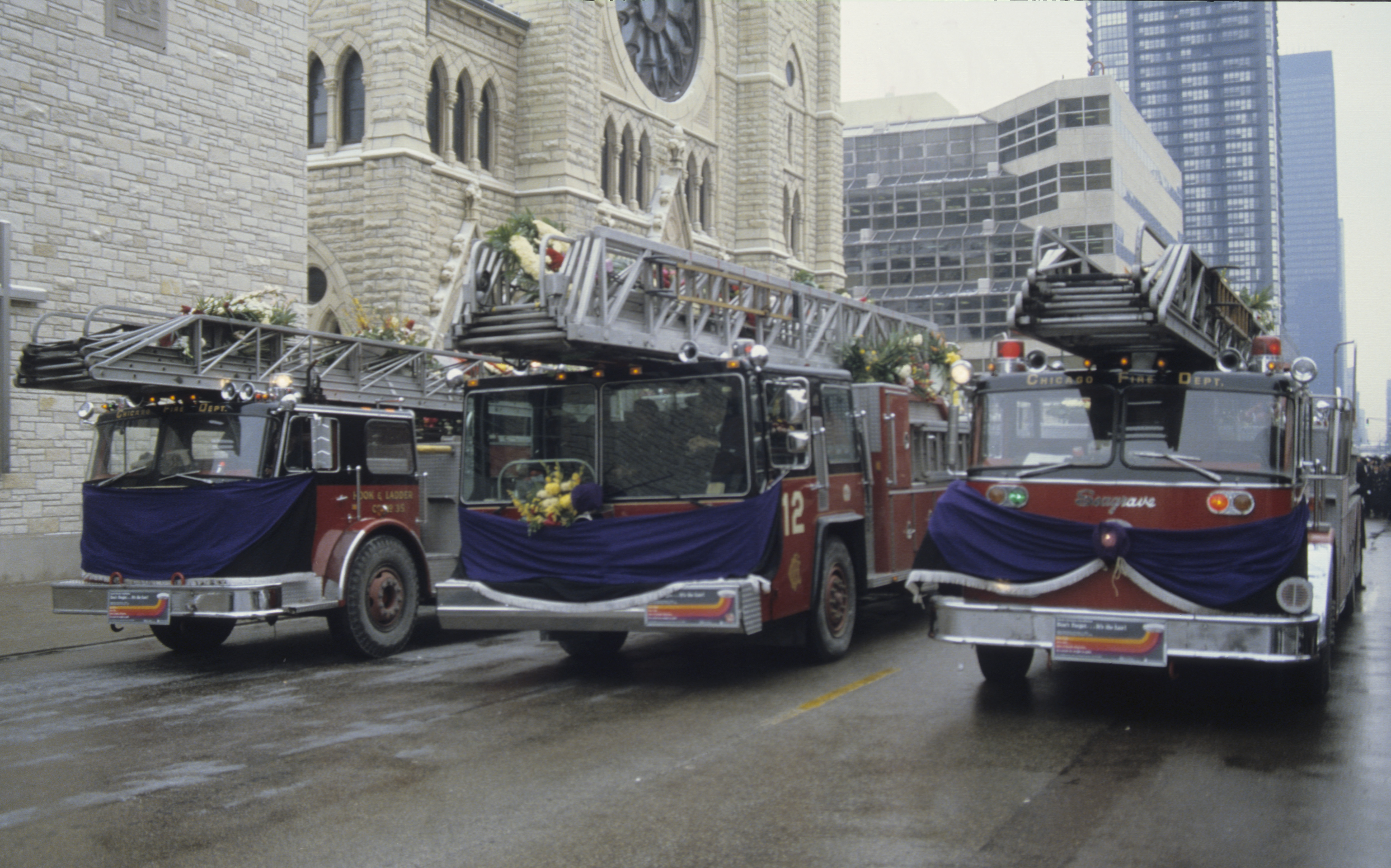 Description: | This photograph shows three pieces of fire apparatus decorated with bunting and flowers outside Holy Name Cathedral for the services of Captain Daniel Nockels and Firefighters Michael Forchione and Michael Talley who died in the line of duty in 1985. |