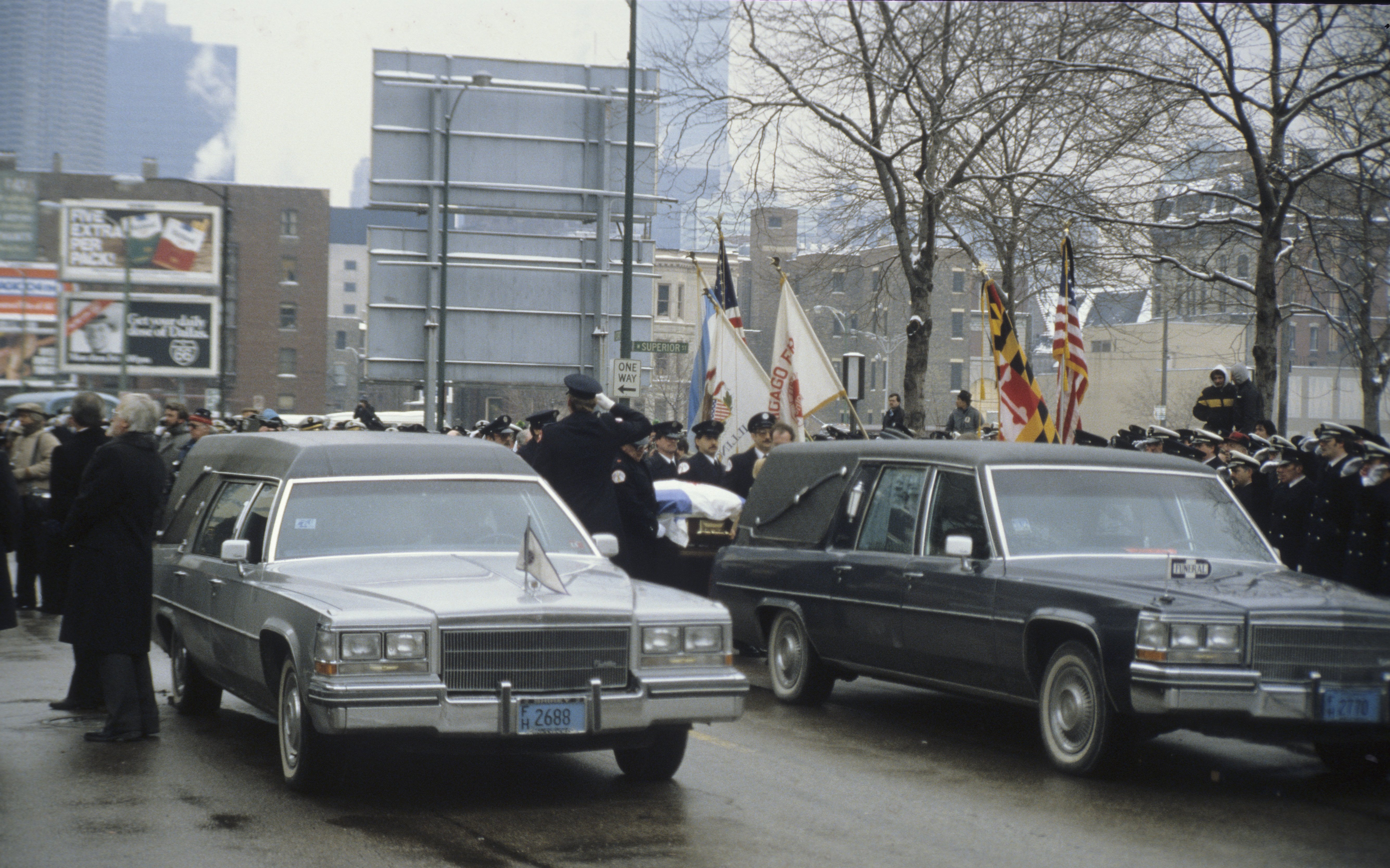 Description: | This photograph shows two hearses and firefighters saluting the flag-draped casket behind one. |