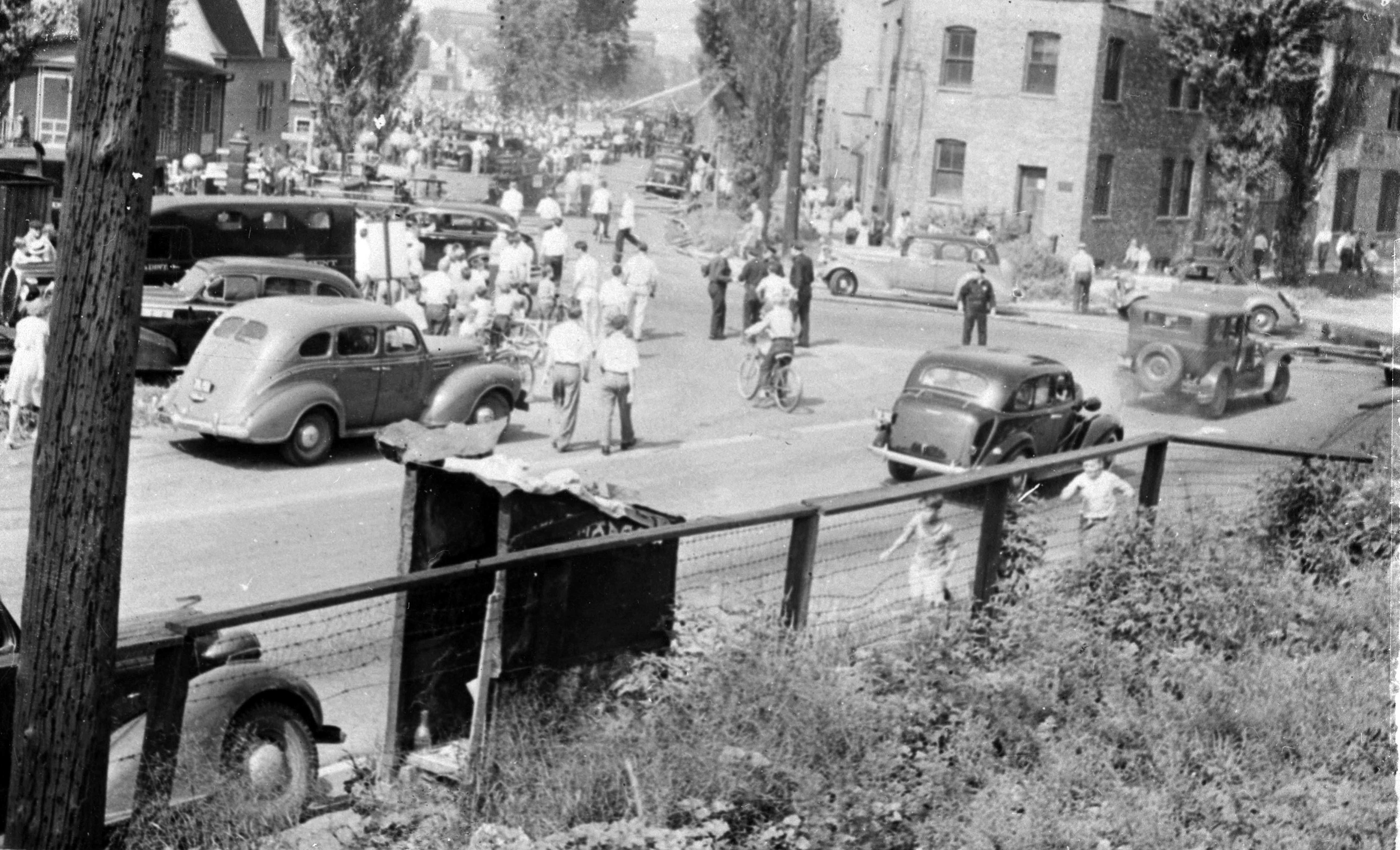 Description: | This photograph shows the intersection and street full of onlookers vehicles and police near the Van Schaak Brothers Chemical Factory. |