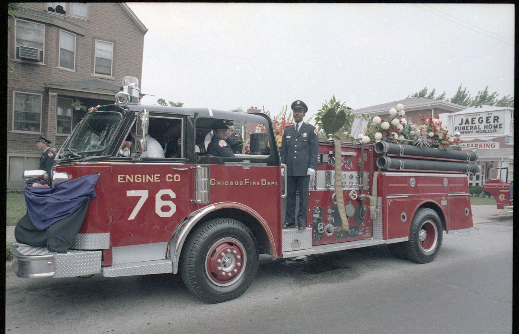 | Description: | This photograph shows a uniformed firefighter standing on a piece of fire apparatus decorated with bunting and flowers in honor of Chicago Fire Department Firefighter Raymond Sidwell who died in the line of duty in 1985. |