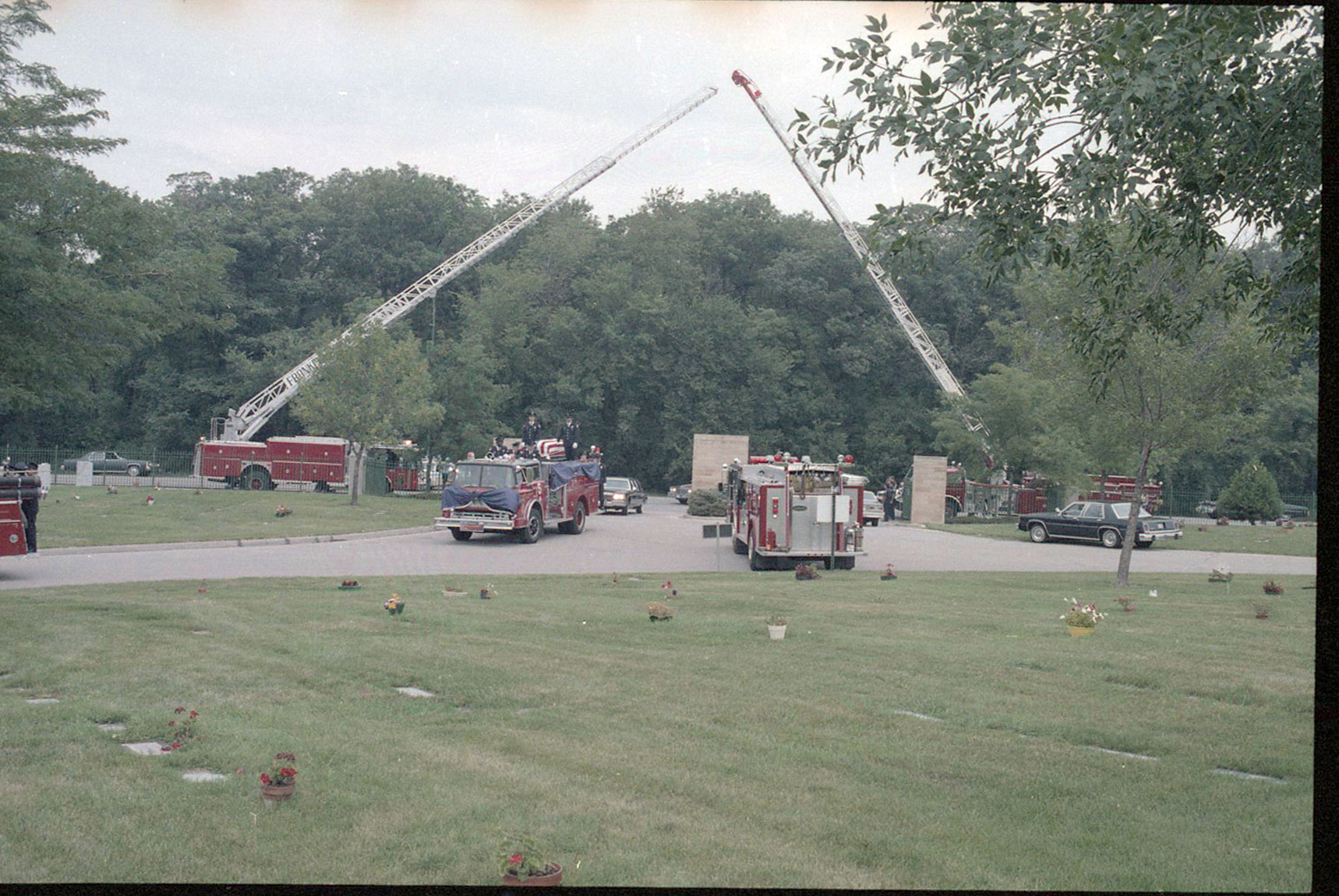 | Description: | This photograph shows two ladder trucks with ladders raised on either side of the graveyard entrance and a decorated piece of fire apparatus carrying the casket of Chicago Fire Department Firefighter Raymond Sidwell who died in the line of duty in 1985. |