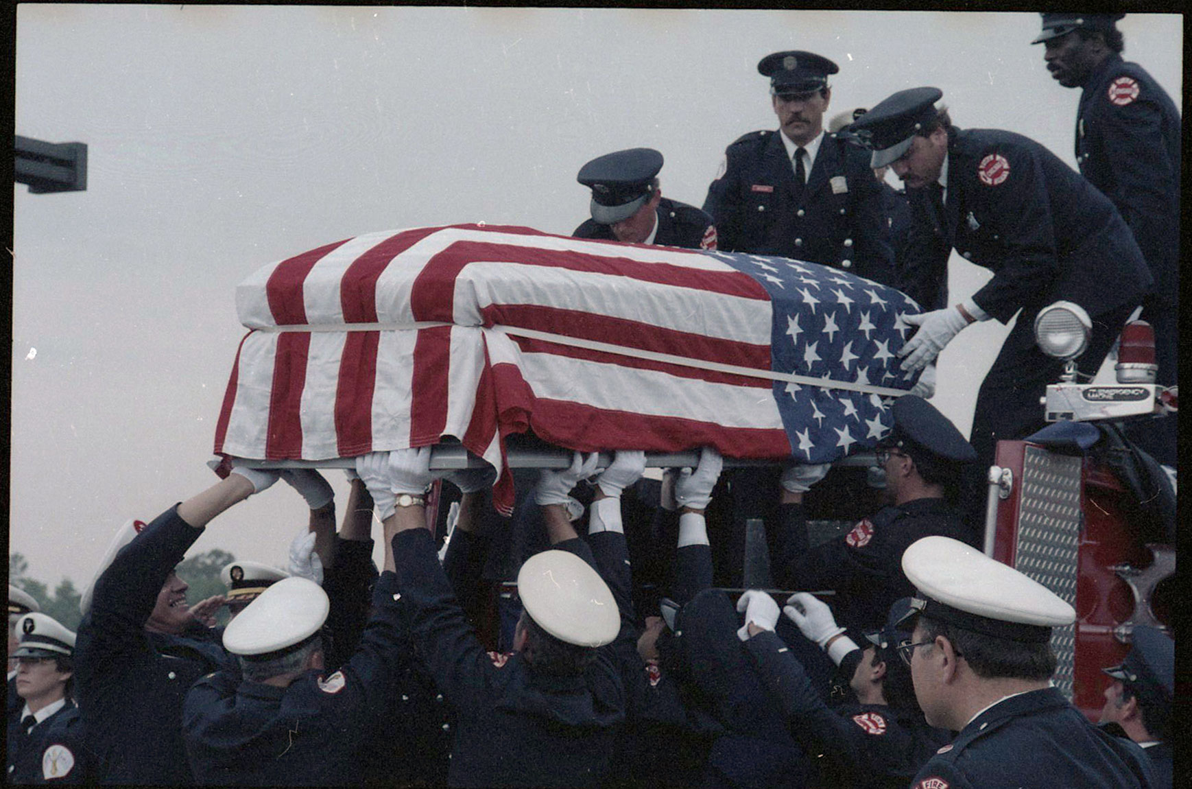 | Description: | This photograph shows firefighters lifting the casket of Chicago Fire Department Firefighter Raymond Sidwell who died in the line of duty in 1985. |