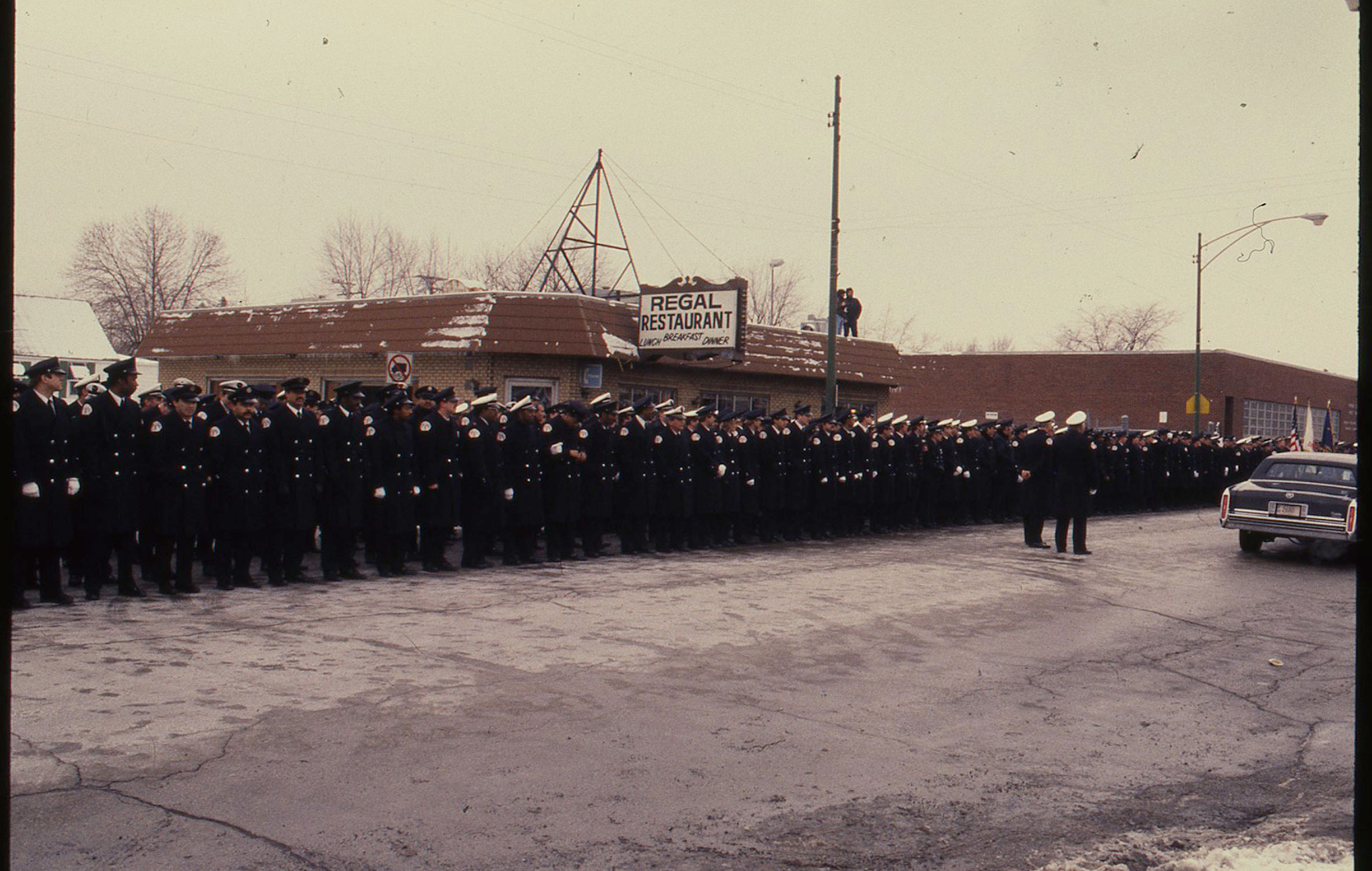 Description: | This photograph shows firefighters lined alongside the road for the procession of Chicago Fire Department Lieutenant Edmund Coglianese who died in the line of duty in 1986. |