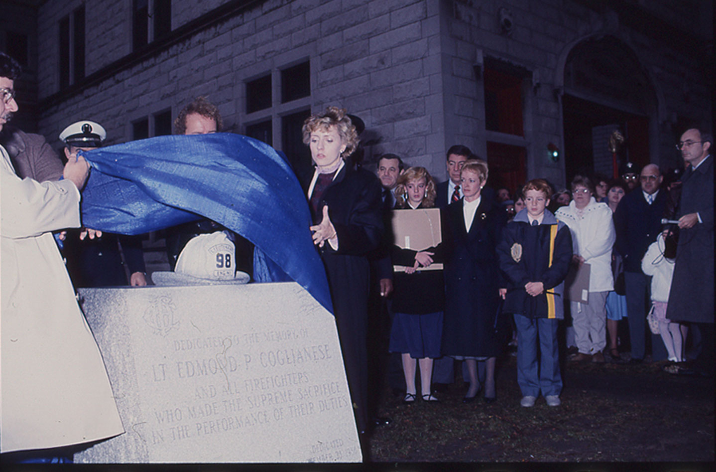 Description: | This photograph shows the unveiling of the monument to Chicago Fire Department Lieutenant Edmond Coglianese who died in the line of duty in 1986. |