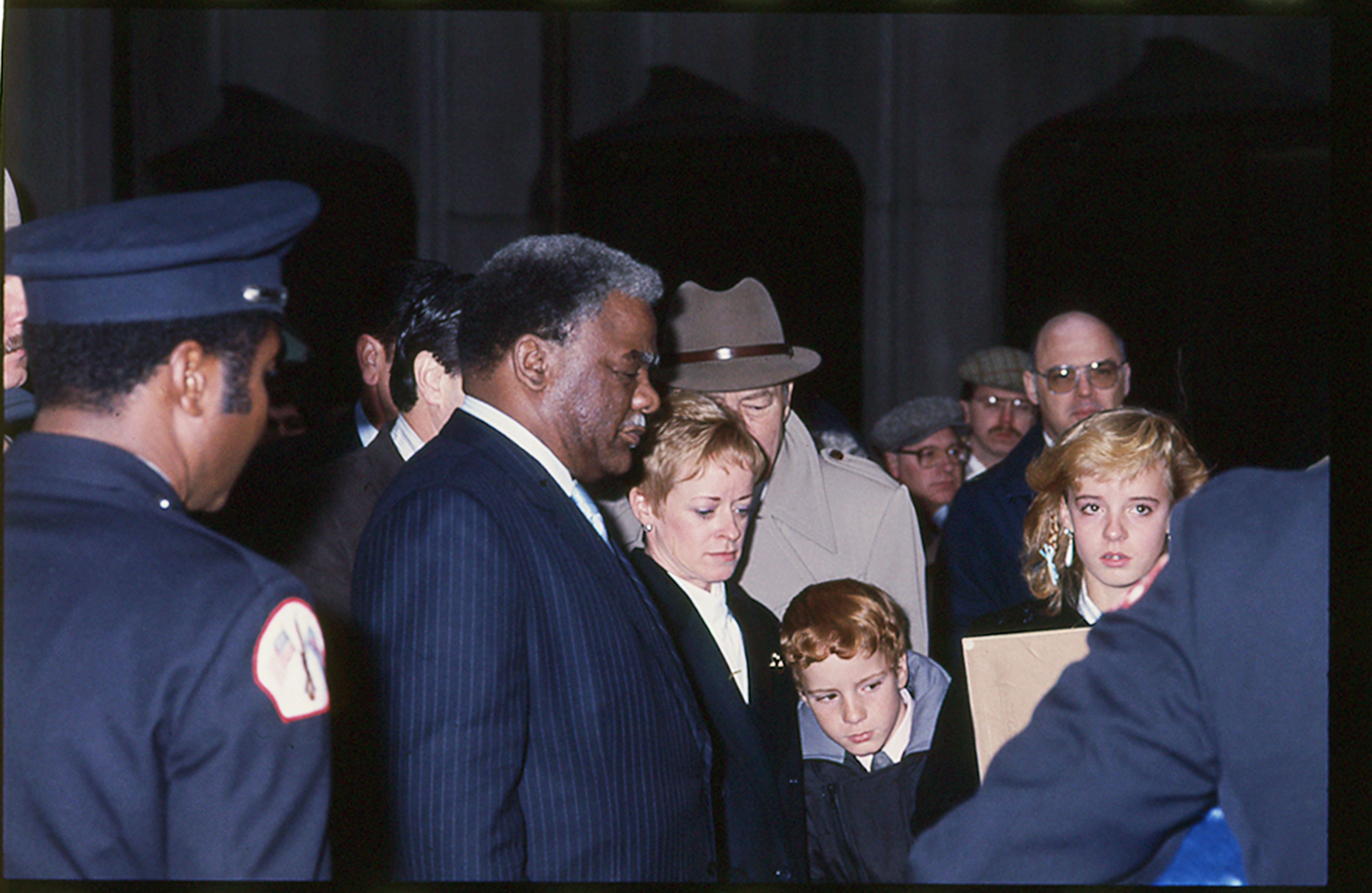 Description: | This photograph shows then-Mayor Harold Washington attending the dedication of a monument to Chicago Fire Department Lieutenant Edmond Coglianese who died in the line of duty in 1986. |